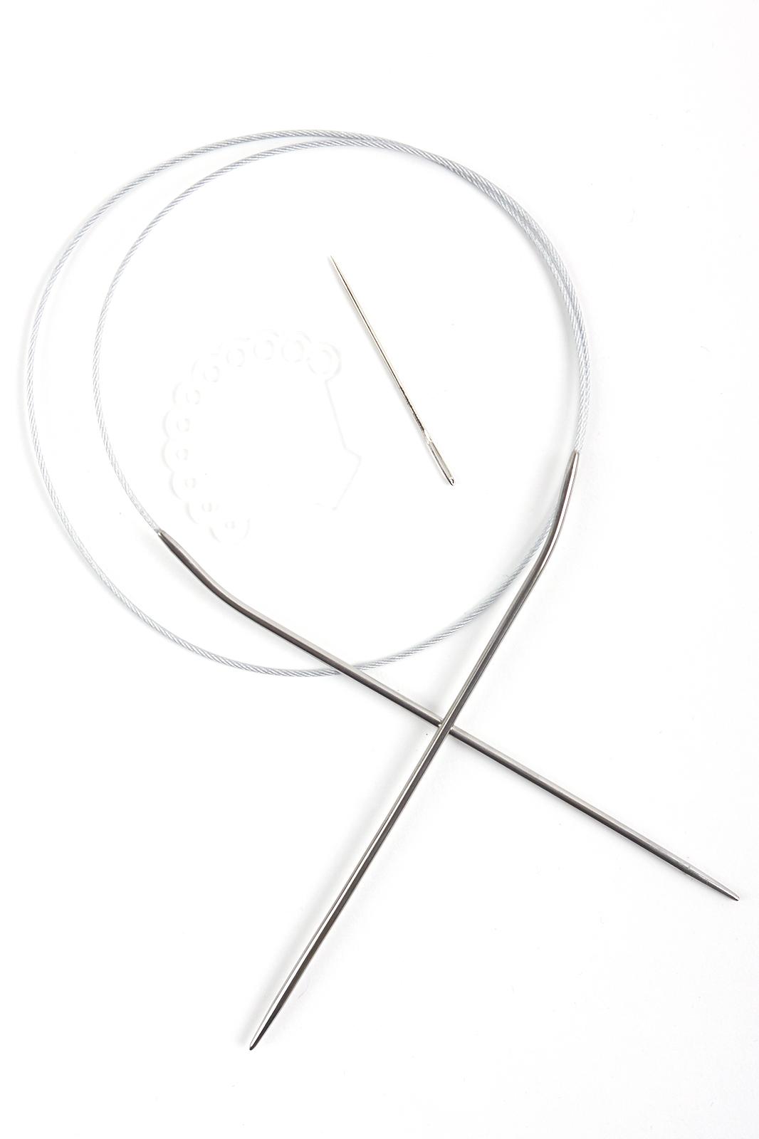 Общая длинна этих круговых спиц, от кончика до кончика 80 см. Размер каждой металлической спицы 13-14 см. Плавный переход в месте крепления тросика и спицы. Комплектуется и иглой для сшивания вязанных изделий.