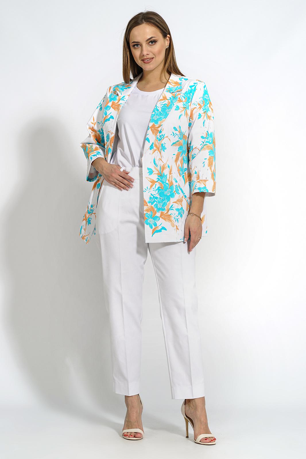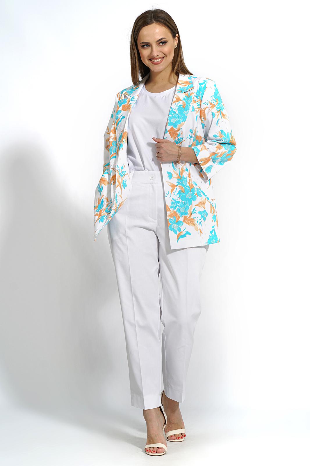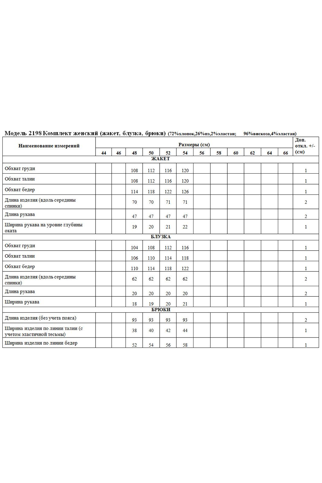 Жакет с втачным рукавом 3/4, без застежки; в блузе рукав втачной короткий; брюки прямые, в поясе по спинке эластичная тесьма.