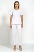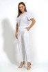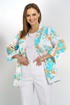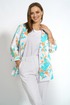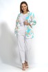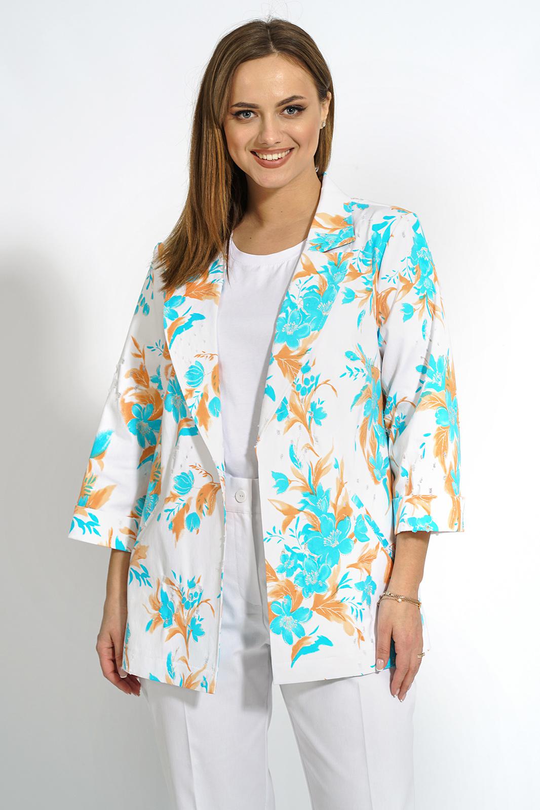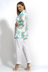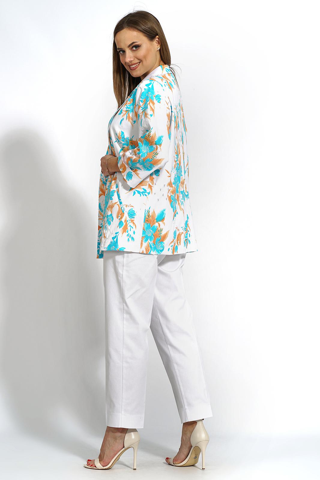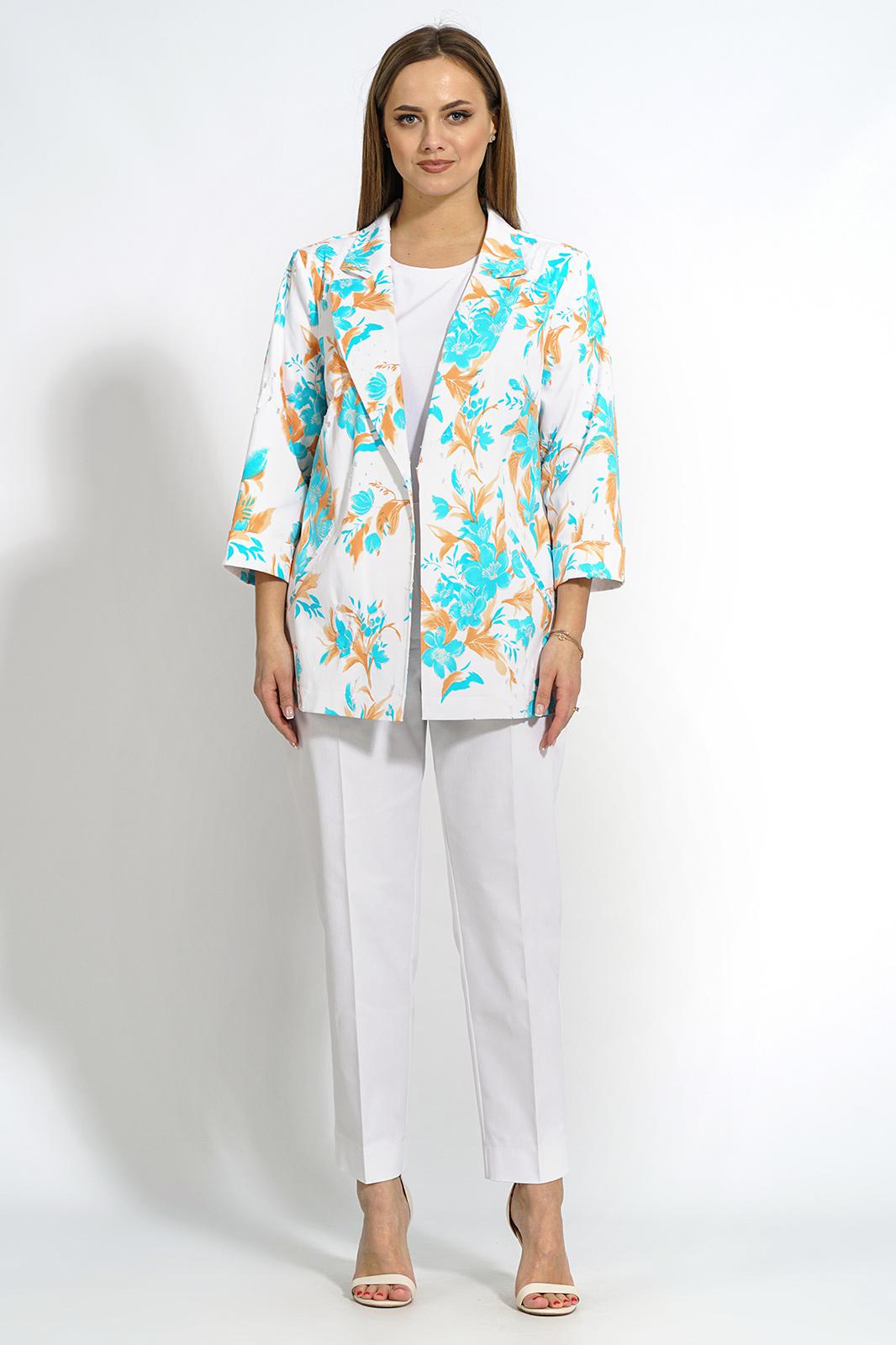 Жакет с втачным рукавом 3/4, без застежки; в блузе рукав втачной короткий; брюки прямые, в поясе по спинке эластичная тесьма.