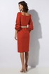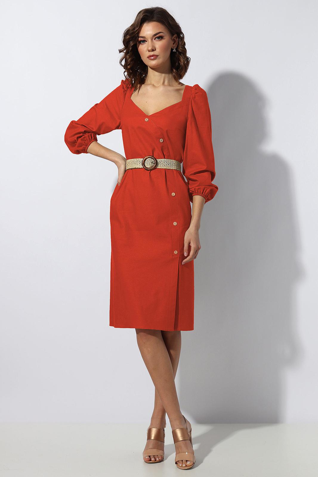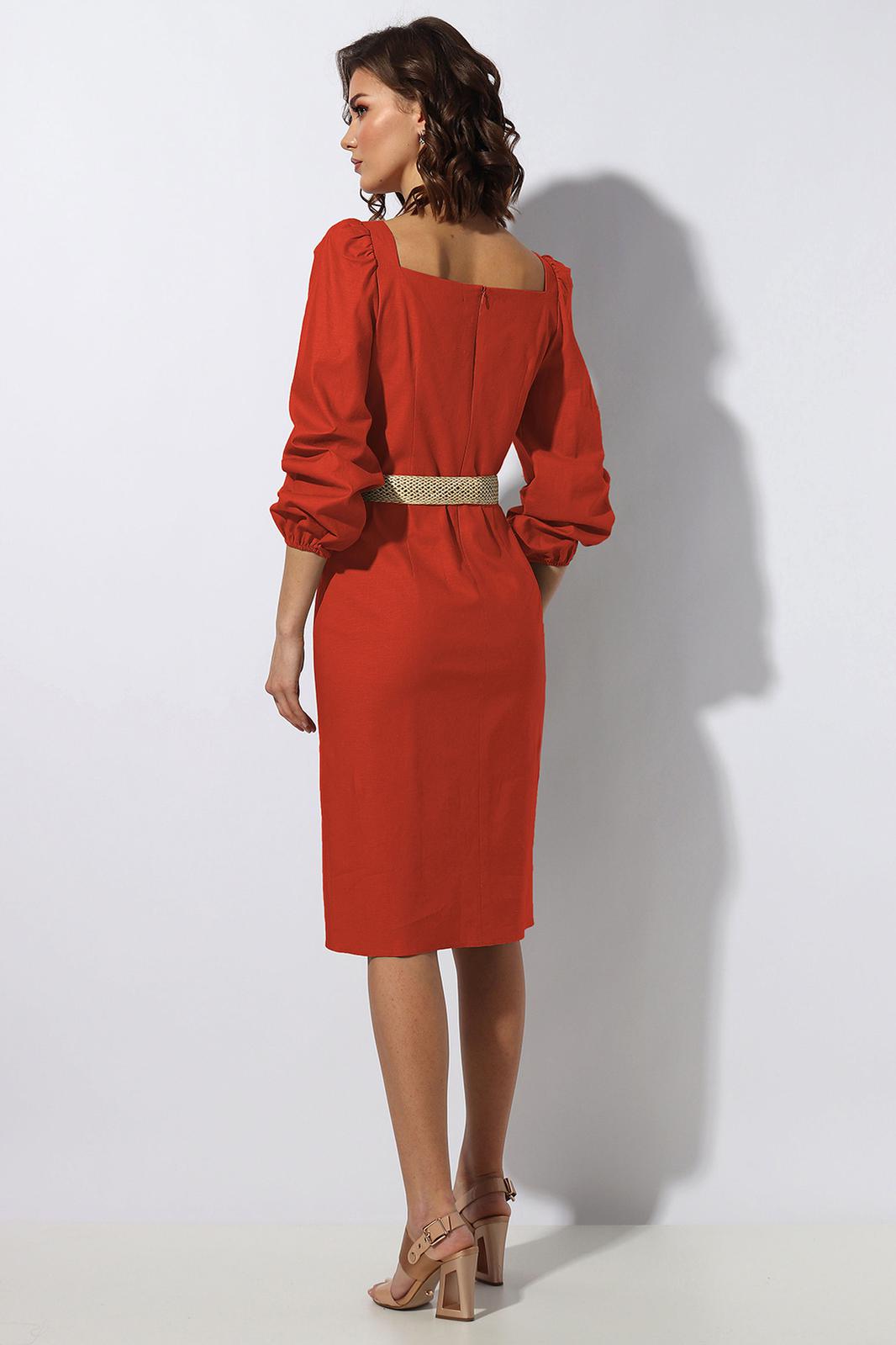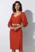 Платье женское полуприлегающего силуэта с фигурным вырезом горловины.На полочке имитация планки выходящая из проймы с отделочными пуговицами в цвет ремня.Верхняя часть рукава со сборкой, нижняя собрана на эластичную тесьму (резинка).Спинка с застёжкой на потайную тесьму молния .По линии талии отделочный плетёный ремень с пряжкой. Длина изделия 95 см .Рукав 63 см. Ремень в комплекте.