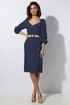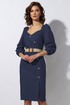 Платье женское полуприлегающего силуэта с фигурным вырезом горловины.На полочке имитация планки выходящая из проймы с отделочными пуговицами в цвет ремня.Верхняя часть рукава со сборкой, нижняя собрана на эластичную тесьму (резинка).Спинка с застёжкой на потайную тесьму молния .По линии талии отделочный плетёный ремень с пряжкой. Длина изделия 95 см .Рукав 63 см. Ремень в комплекте.