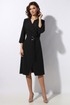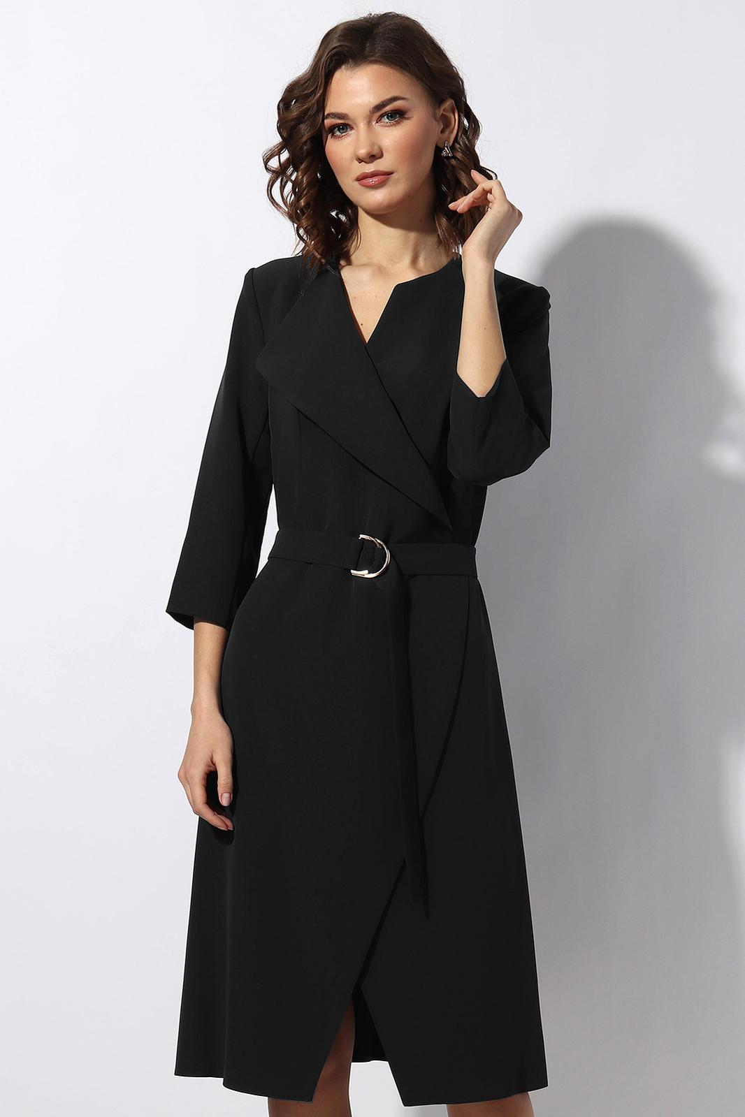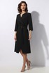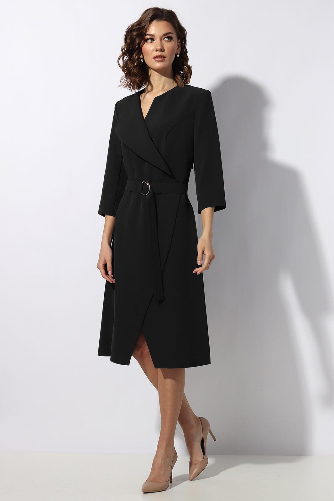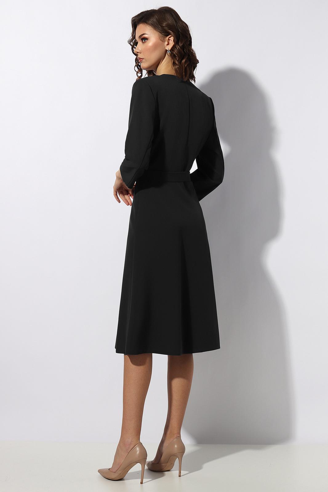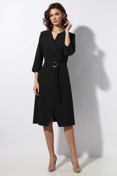 Платье женское отрезное по линии талии.Верхняя часть платья полуприлегающего силуэта с запахом и асимметричным вырезом горловины.Нижняя часть платья расширенная к низу на запах.В боковом шве застёжка на потайную тесьму молния.Рукав втачной 3/4.По линии талии пояс с пряжкой.Длина платья по спинке 107 см.Длина рукава 44 см.