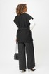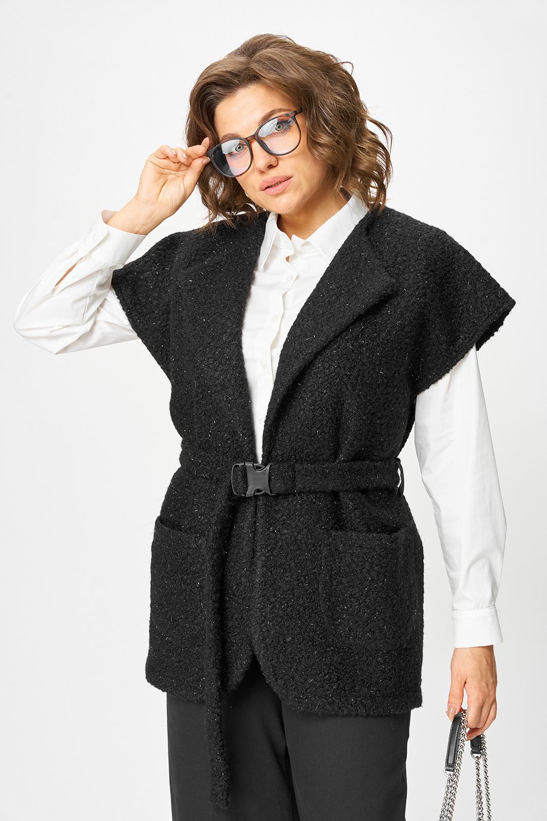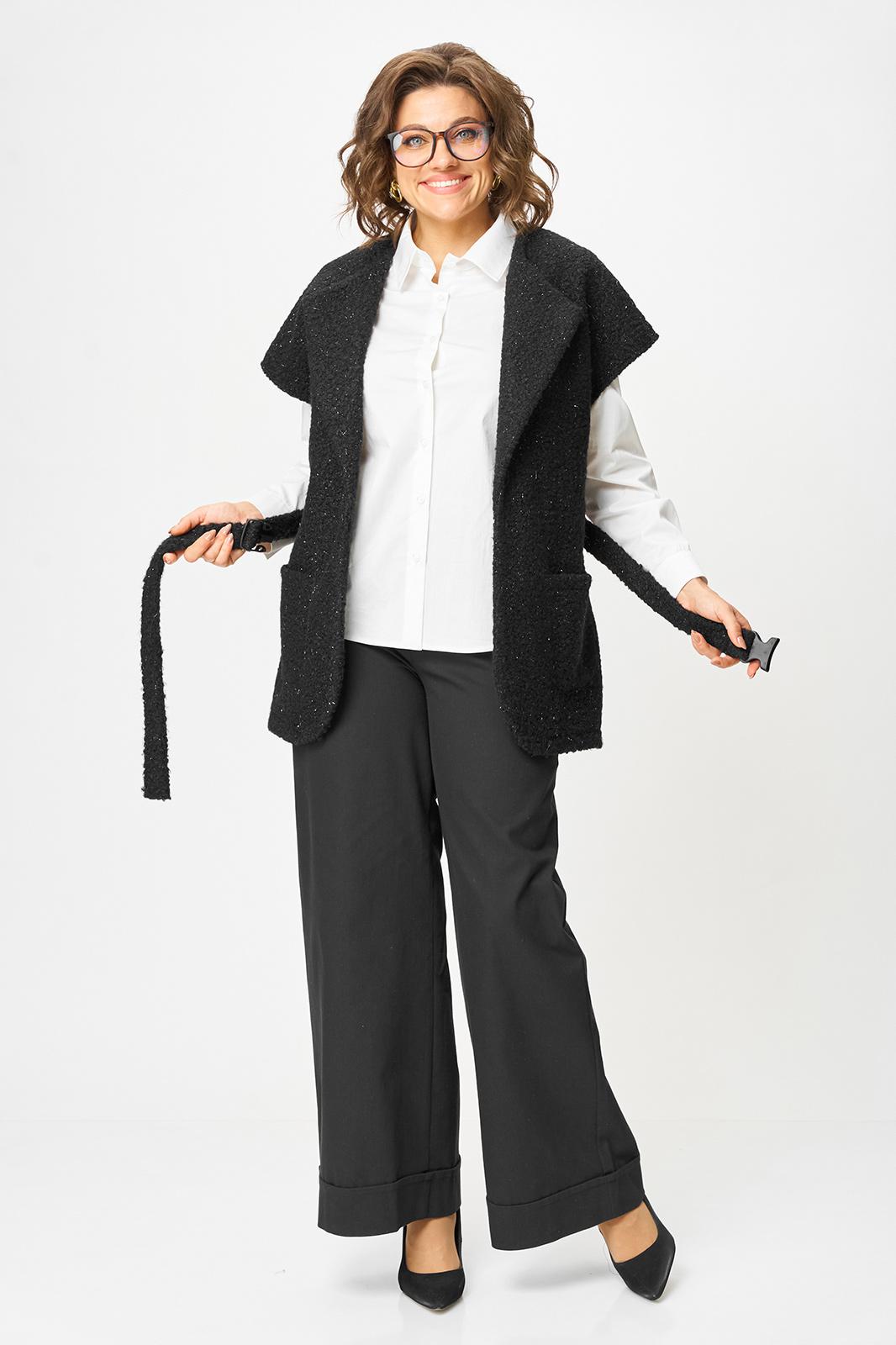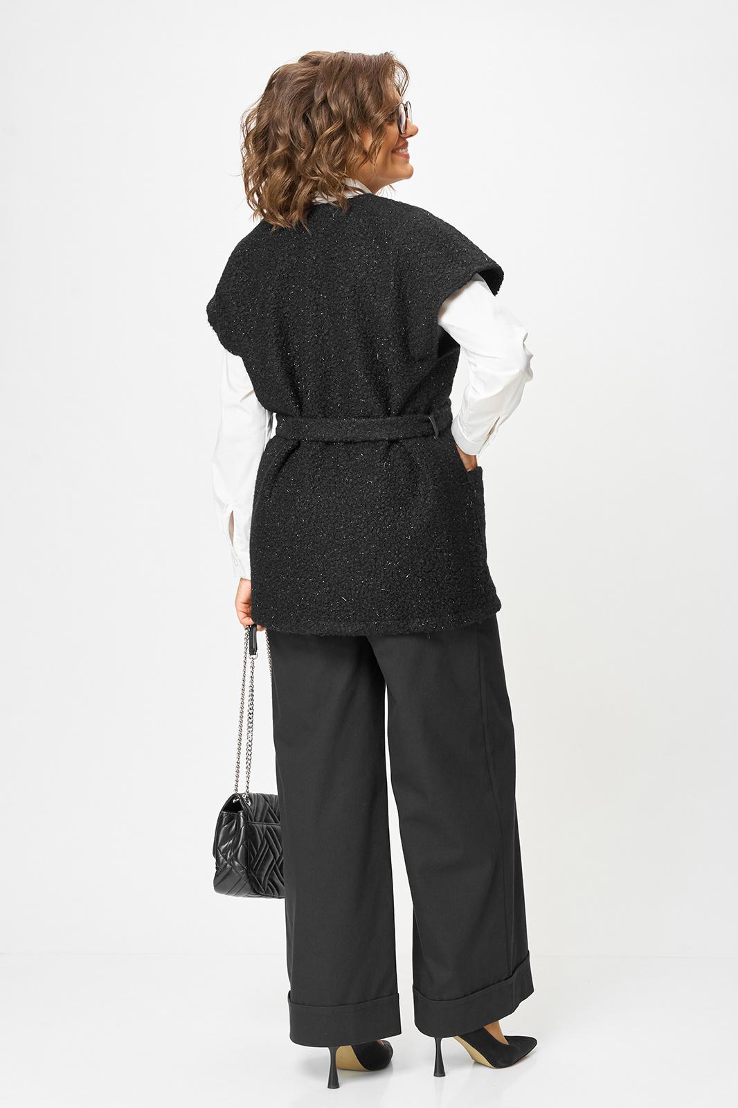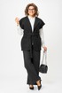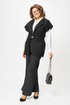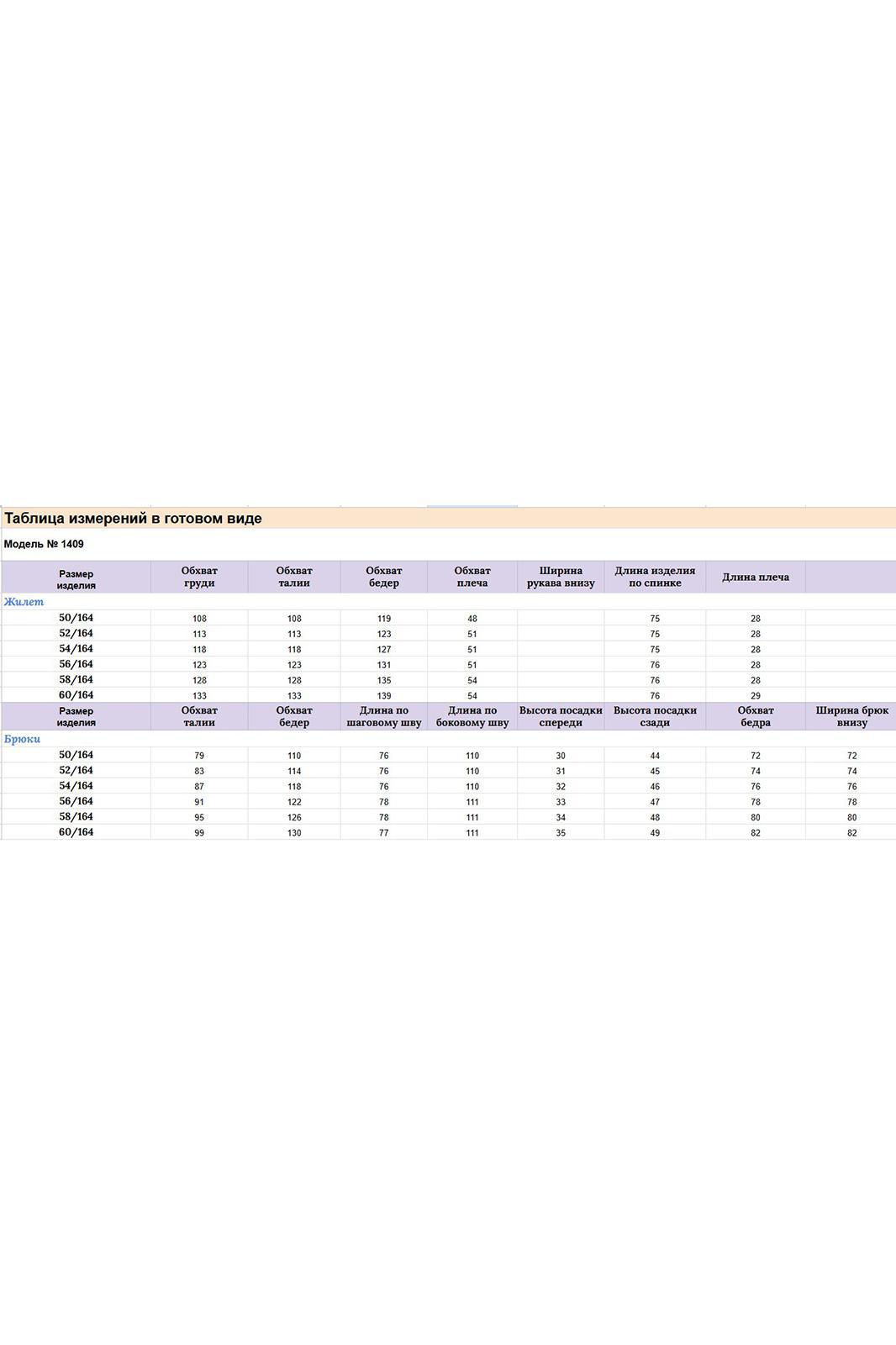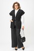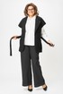 Эффектный и универсальный женский костюм состоящий из двух предметов: удлиненного жилета и брюк-палаццо. Жилет прямого полуприлегающего силуэта с пиджачным воротником (раскладными лацканами), также на жилете имеются накладные карманы. Изделие выполнено из плотного трикотажа с ненавязчивым блеском. Широкие брюки-палаццо, по низу с цельнокроеной манжетой; по верху на притачном поясе с резинкой по спинке, застежка в левом боковом шве на тесьму молнию. К костюму прилагается съемный пояс с застежкой-карабином. Длина жилета по спинке 75 см(+-1см), длина плеча 28см(+-1см). Длина брюк по боковому шву 110см(+-1см), длин брюк по шаговому шву 76см(+-1см).