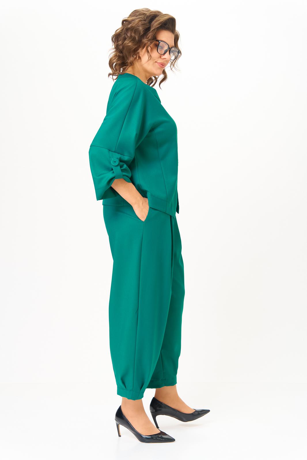 Универсальный костюм, который выглядит дорого и современно, но при этом дарит комфорт и лёгкость. Его можно носить как комплект или по отдельности: жакет с асимметричной застёжкой и акцентными пуговицами легко сочетается с джинсами, а брюки свободного кроя идеально смотрятся с блузой или футболкой.