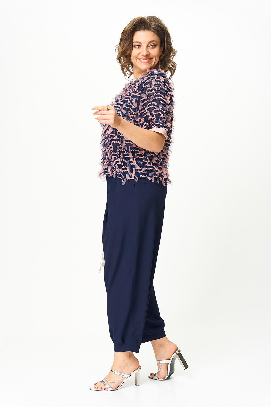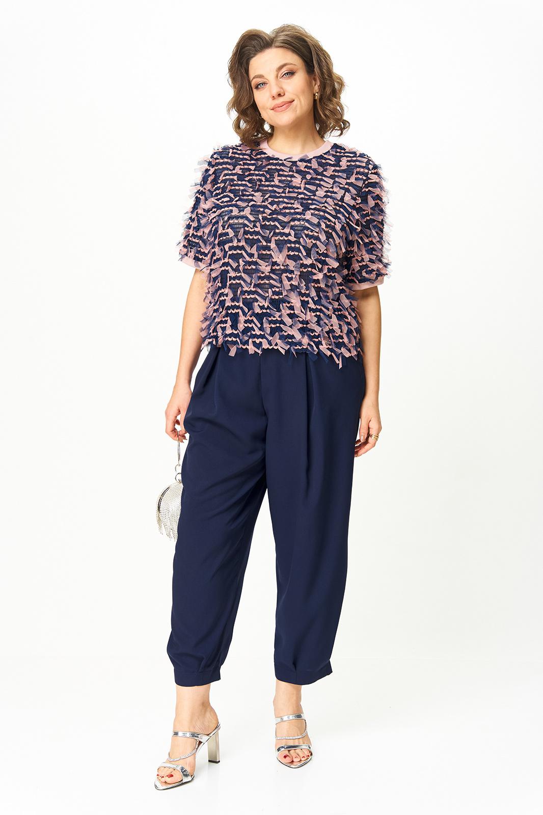 Этот комплект — словно сказочная принцесса в реальном мире. Нежная кофточка из сетки с множеством крошечных бантиков выглядит воздушно и придаёт образу легкость и очарование. Она будто создана для того, чтобы подчеркнуть женственность и добавить немного игры в повседневность. Брюки из мягкой струящейся ткани с благородным сатиновым эффектом дополняют верх идеальной посадкой и лёгким блеском. Вместе они создают праздничное настроение, а по отдельности — дают бесконечные возможности для стильных сочетаний.
