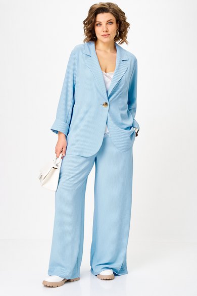 Есть вещи, которые сразу работают на образ. Этот костюм выбирают женщины, которым важны статус и лёгкость без суеты. Вертикальная полоска визуально вытягивает силуэт и стройнит, а струящаяся ткань красиво ведёт линию движения. Удлинённый жакет застёгивается на одну пуговицу — актуальный акцент сезона, который подчёркивает талию и делает силуэт современным.