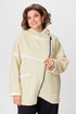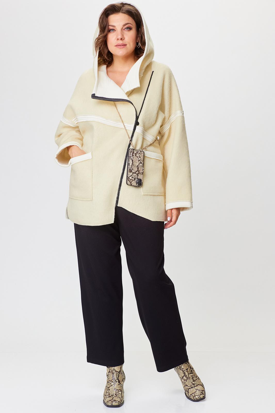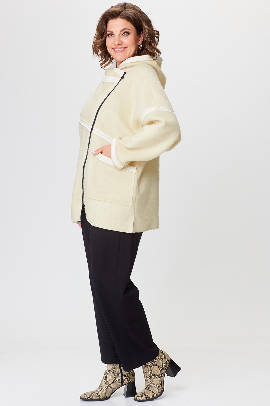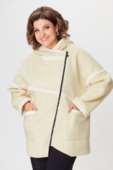 Женское полупальто для повседневной носки из однотонного трикотажа — букле. Полупальто свободного кроя с капюшоном. Плечо спущенное, рукав длинный втачной. Перед изделия с асимметричной косой застежкой на разъемную тесьму-молнию. Спинка прямая цельная. Полупальто украшено рельефными швами срезами наружу. По переду накладные карманы. Низ изделия разноуровневый с необработанным краем. Полупальто смело сочетается с любым низом (юбка, брюки, джинсы) и обувью. Длина по спинке 75 см, длина рукава от горловины 74 см.