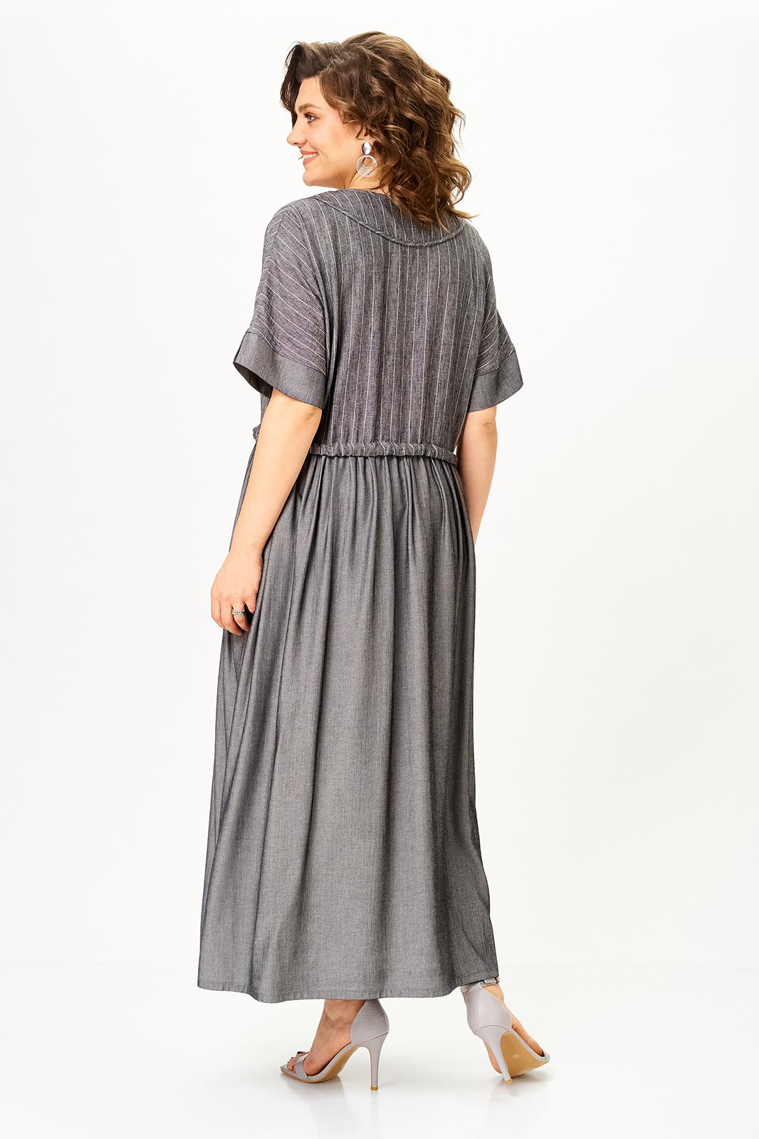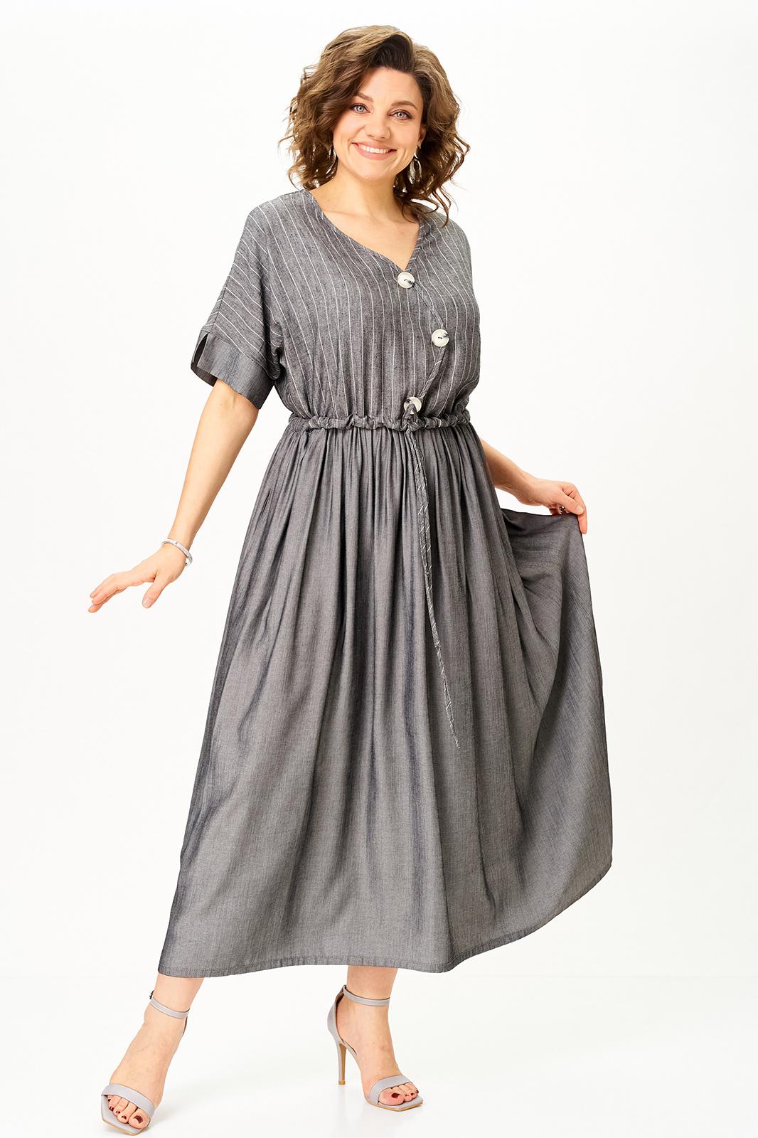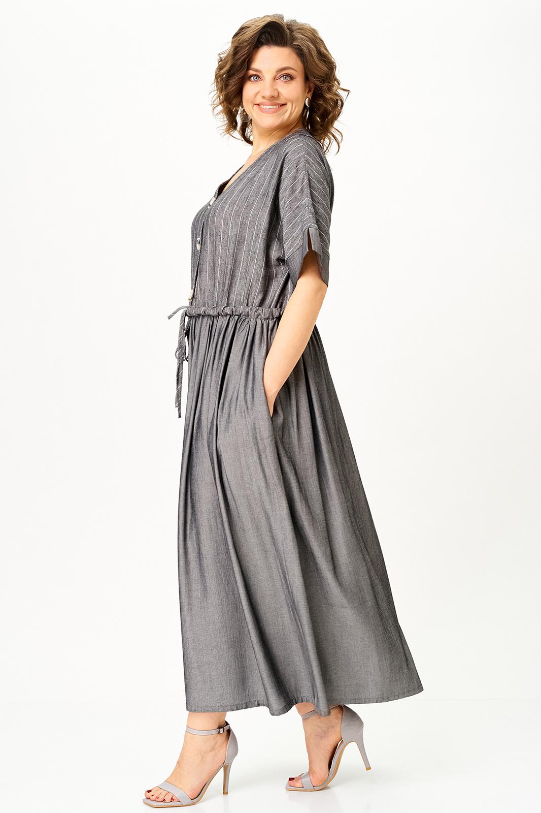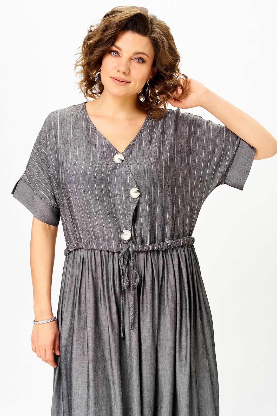 Верх выполнен из лёгкого льна с деликатной полоской, низ — из струящейся вискозы, благодаря чему платье красиво движется при ходьбе и создаёт ощущение лёгкости.