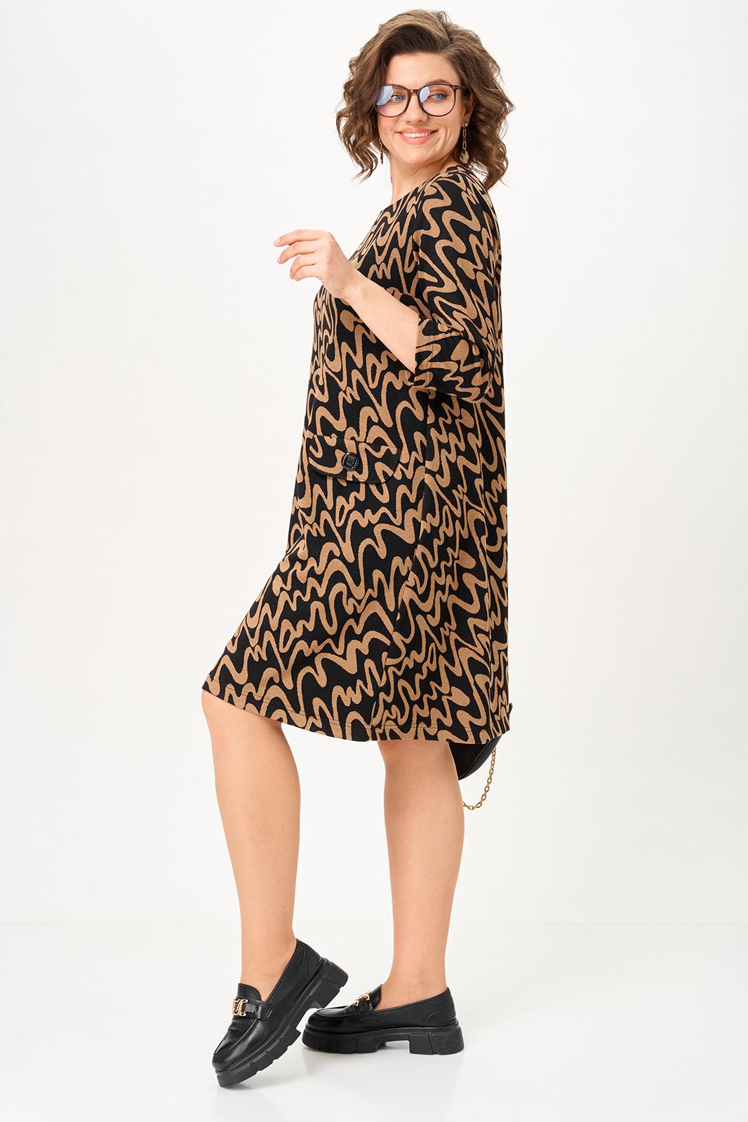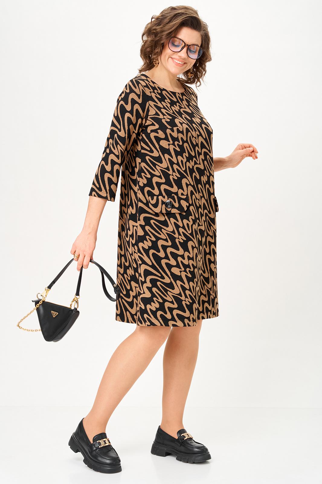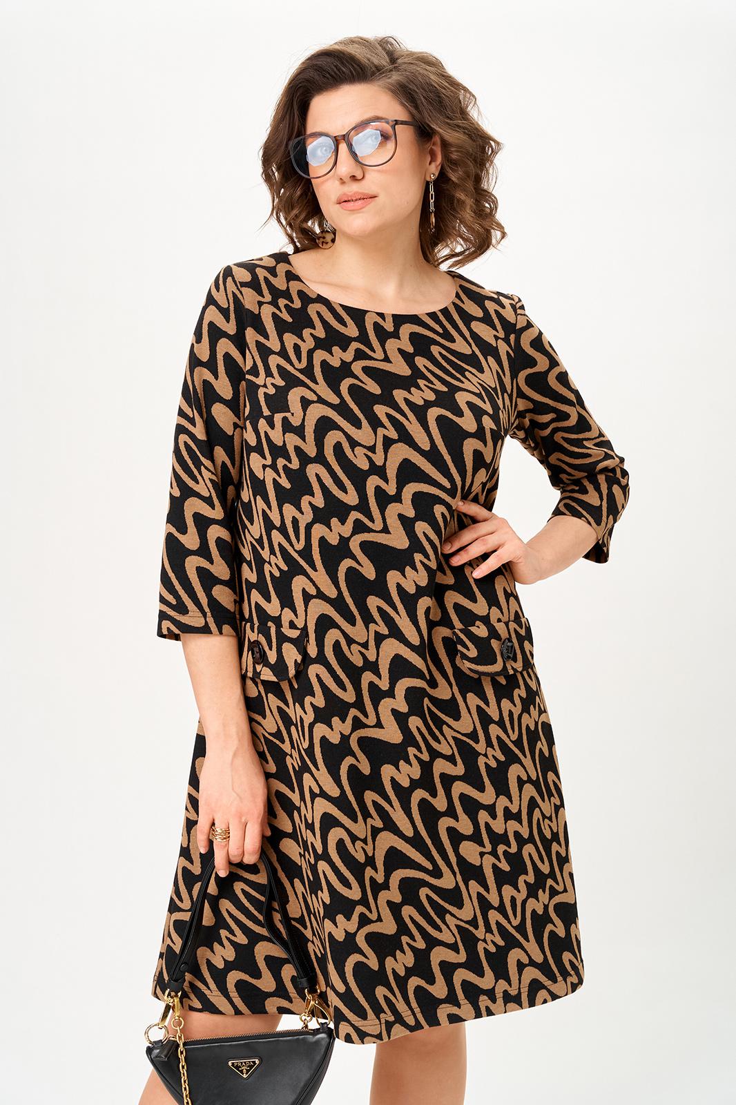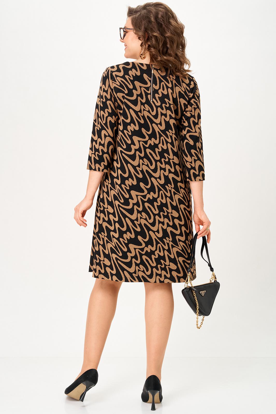 Свободный А-образный крой деликатно скрывает нюансы фигуры и красиво движется в шаге. Рукав 3/4 делает платье идеальным для переходного сезона, а декоративные клапаны «заземляют» принт, добавляя образу собранности и универсальности. Сзади аккуратная молния для удобной посадки.