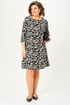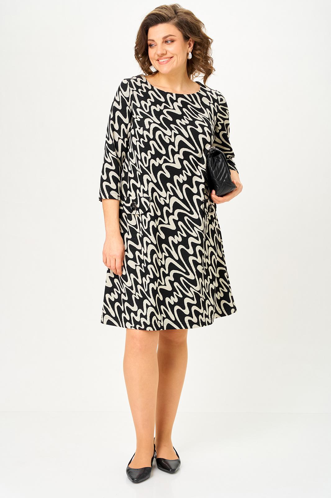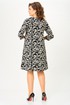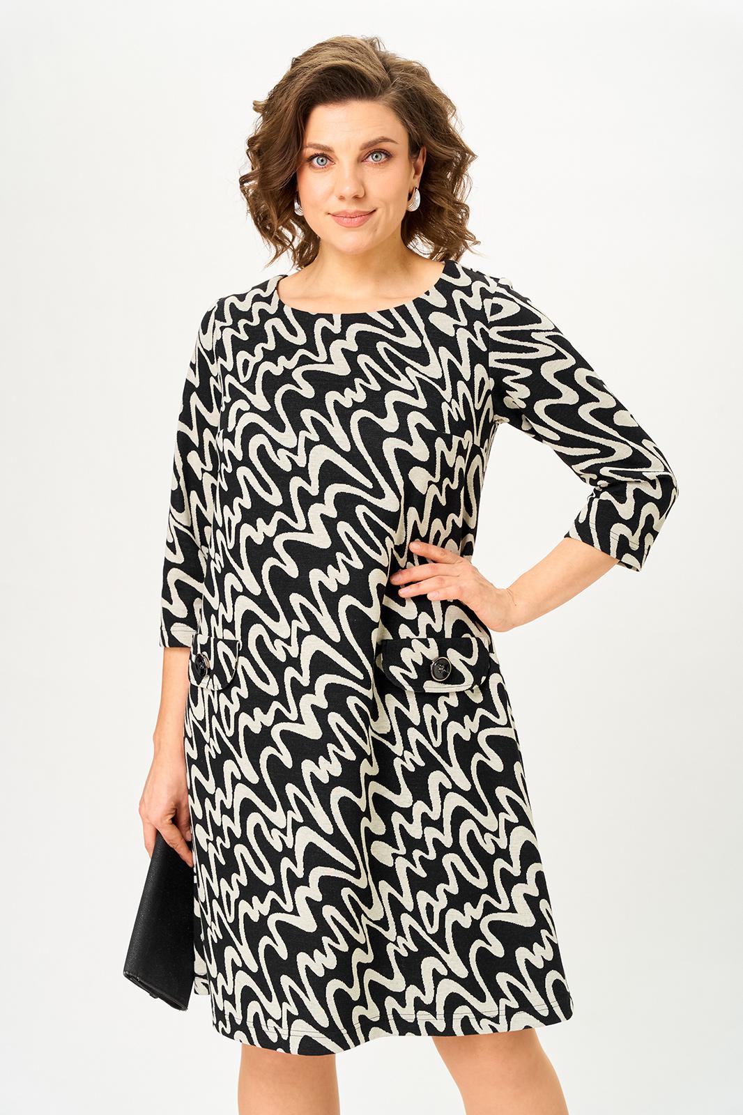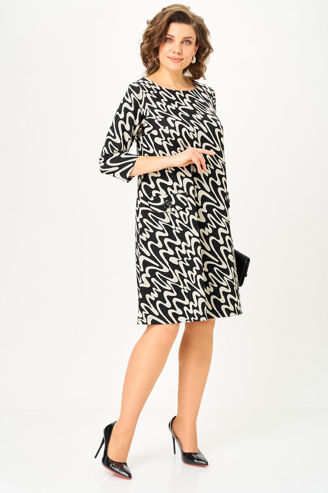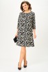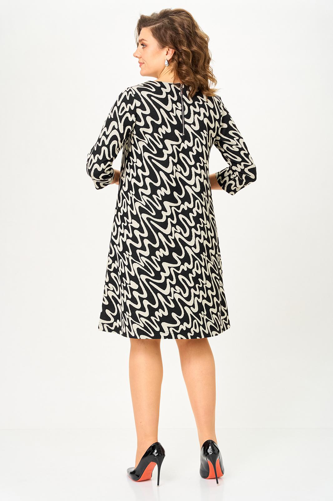 Свободный А-образный крой деликатно скрывает нюансы фигуры и красиво движется в шаге. Рукав 3/4 делает платье идеальным для переходного сезона, а декоративные клапаны «заземляют» принт, добавляя образу собранности и универсальности. Сзади аккуратная молния для удобной посадки.