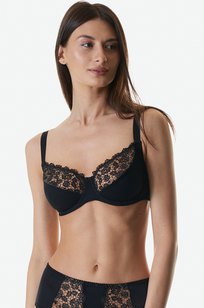 Полудублированная чашка, на каркасах.Хлопковая одкладка в нижней части чашек. Стан комбинированный, упругие пластины в боковых деталях.по линии декольте-вышивка.