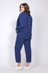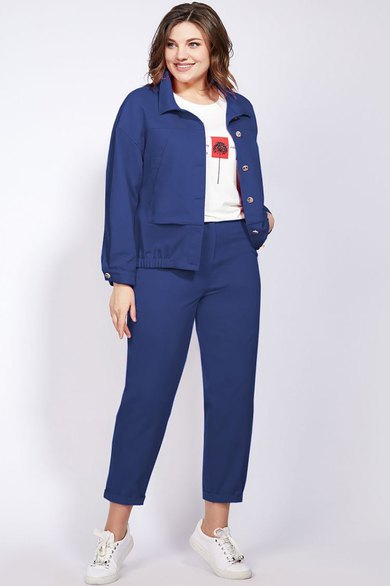 Комплект женский, состоящий из джинсовки, футболки и брюк. Джинсовка свободного силуэта, со спущенным рукавом, на манжете-с застёжкой на петлю-пуговицу. По переду накладные фигурные карманы. По спинке кокетка и декоративная застёжка с пуговицами. Джинсовка с застёжкой на петли-пуговицы, с фигурным низом, по переду-на резинке. Футболка свободного силуэта, рукав короткий, втачной, с манжетой. Округлый вырез горловины. Брюки-бананы, по переду карманы хулиганы, сзади на кокетке. Пояс на резинке. По переду застёжка на тесьму-молнию и пуговицу. Длина по спинке джинсовки-70см, длина рукава от горловины-69см. Длина по спинке футболки-61см, длина рукава-24см. Длина брюк-98см.