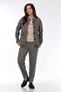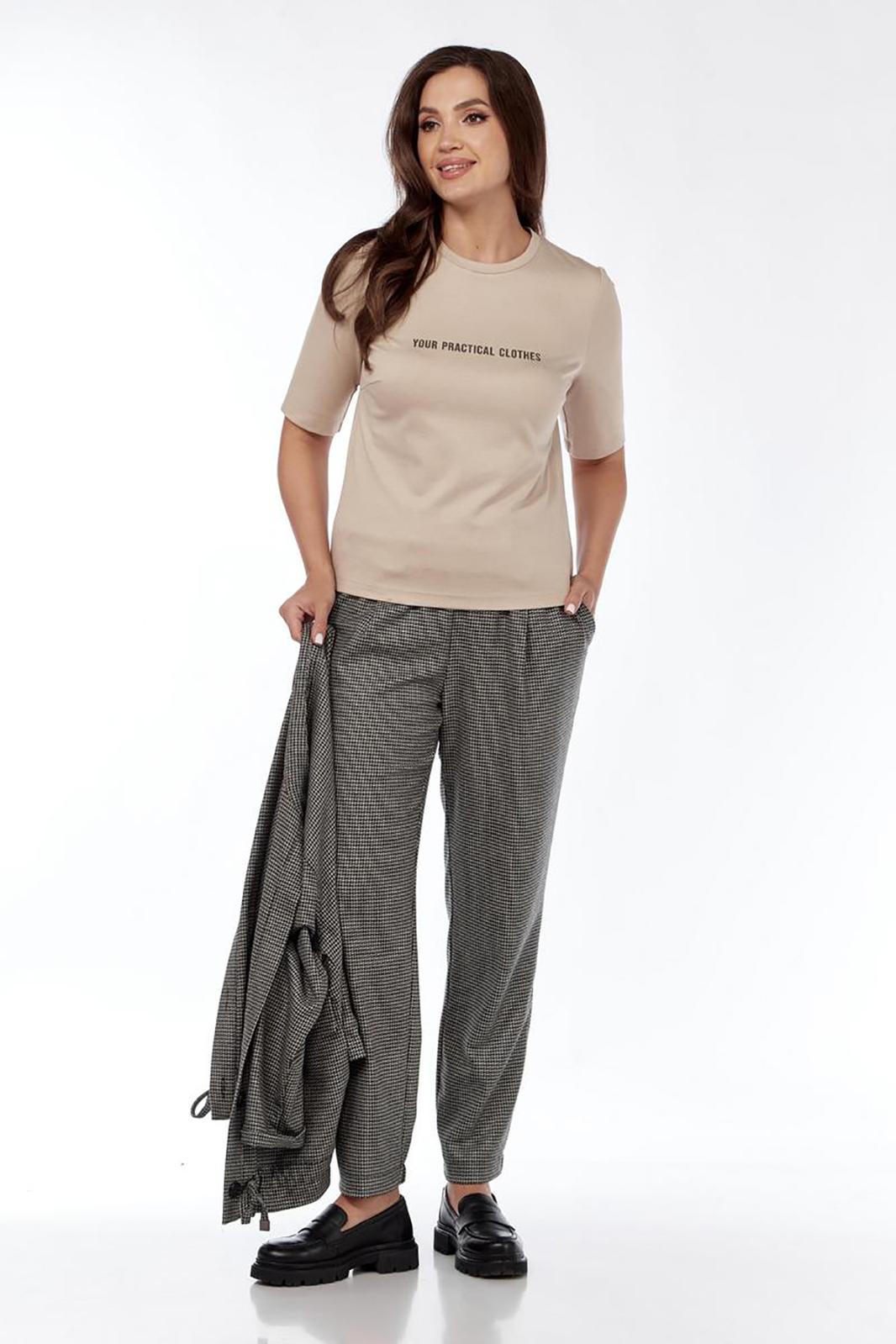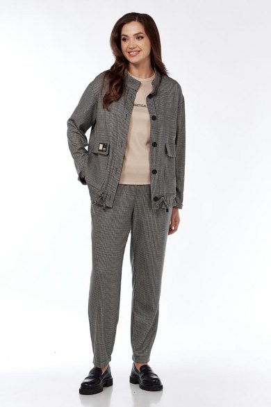 Комплект женский, состоящий из жакета, блузки и брюк, свободного кроя. Жакет с воротником-стойкой, с планкой по полочке, застёжка на петли-пуговицы, на полочке функциональные накладные карманы с клапаном , с элементом декоративной нашивки. Низ жакета отделан кулиской, которую можно присобрать. Спущенный рукав. Спинка жакета со средним швом. Блузка трикотажная, с округлым вырезом , отделана обтачкой, с печатью на полочке, с коротким рукавом. Брюки прямые. По передней части брюк-складки, идущие от кокетки, карманы. По задней части брюк-листочки, низ брюк-на резинке. Пояс на резинке, с отделочным шнуром.
