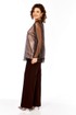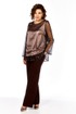 Костюм праздничный брючный. Состоит из блузы и брюк. Блуза двухслойная. Горловина округлая, вытачки по груди, рукава верхнего слоя втачные, на спинке шов в котором обработан разрез. Брюки прямого силуэта, со стрелками, пояс притачной по талии на резинке от бокового шва, с застежкой на тесьму-молнию и пуговицу, по переду имеются действующие карманы-хулиганы.