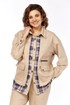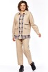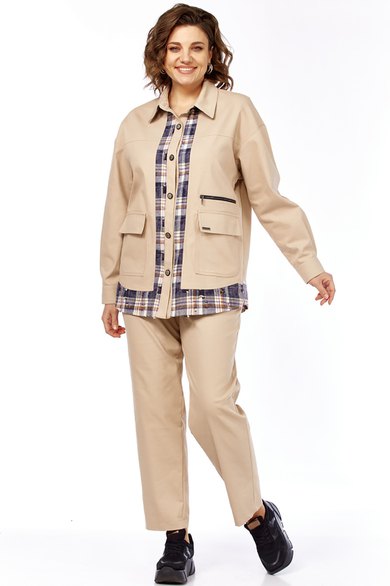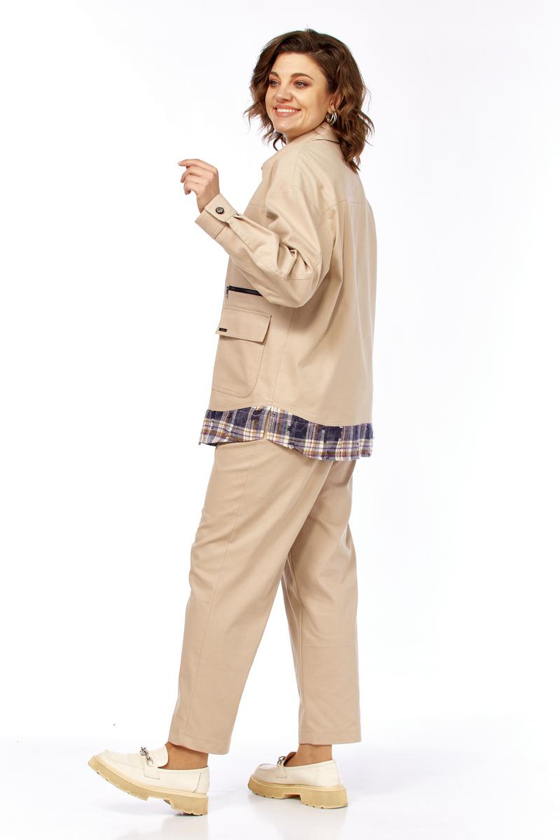 Костюм женский, состоящий из рубашки и брюк. Рубашка свободного силуэта. Рукав спущенный, низ обработан манжетой. По переду накладные карманы с клапанами и молнией для декора (не функциональные). Воротник рубашечного типа. Спереди застежка на петли и пуговицы. Брюки-бананы, заужены к низу. Талия на резинке, в боковых швах – карманы, изделие без застежки
