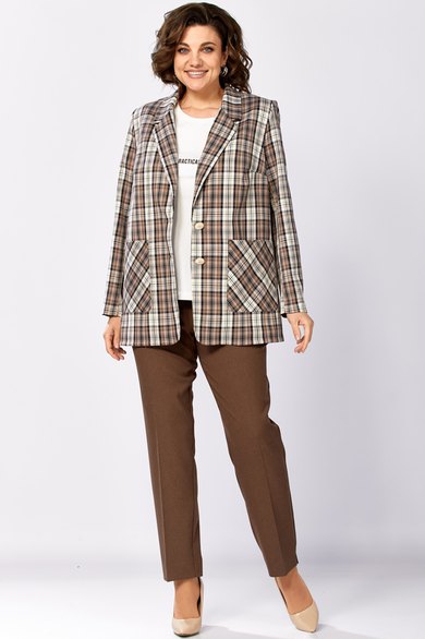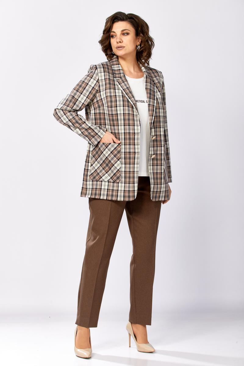 Комплект женский, состоящий из жакета, футболки и брюк. Жакет свободного силуэта, спереди на подкладке. Воротник пиджачного типа, застёжка на петли-пуговицы, по переду накладные карманы. Футболка свободного силуэта, с рукавом, по переду - декоративный принт. Брюки свободные, по талии на резинке, по переду застёжка на петлю-пуговицу и молнию. В боковых швах - иммитация карманов.