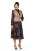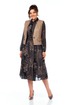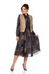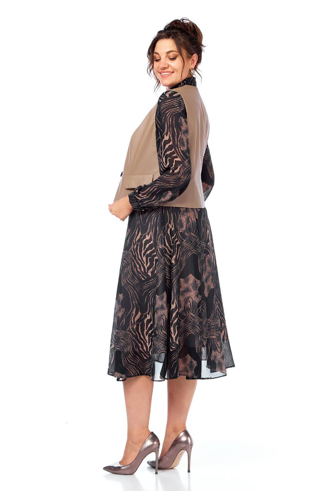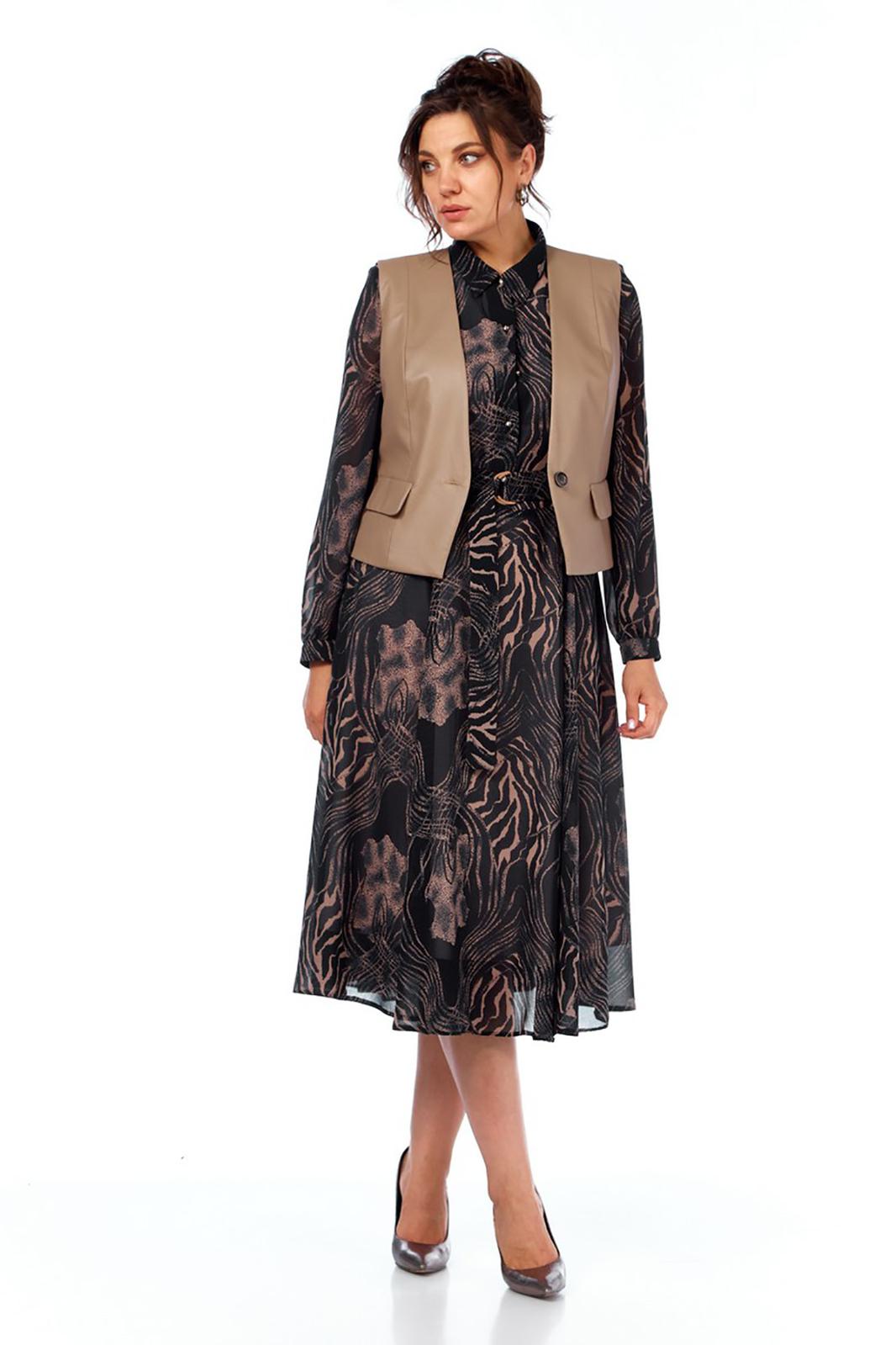 Комплект женский, состоящий из платья и жилета. Платье свободного силуэта, трикотажное, без подкладки. Рукав втачной, снизу собран на манжету, манжета застегивается на петлю и пуговицу. По талии платье отрезное, спереди до талии планка на петли и пуговицы и нагрудные вытачки, которые позволяют создать идеальную посадку по груди. Юбка-шестиклинка. Дополнительно в комплекте к платью присутствует пояс из основной ткани. Жилет полуприлегающего силуэта из эко-кожи, с накладными декоративными клапанами, застежка на одну петлю и пуговицу.