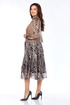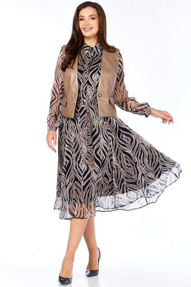 Комплект женский, состоящий из платья и жилета. Платье свободного силуэта, шифоновое, полностью на подкладке. Рукав втачной, снизу собран на манжету, манжета застегивается на петлю и пуговицу. По талии платье отрезное, спереди до талии планка на петли и пуговицы и нагрудные вытачки, которые позволяют создать идеальную посадку по груди. Юбка-шестиклинка. Дополнительно в комплекте к платью присутствует пояс из основной ткани. Жилет полуприлегающего силуэта из эко-кожи, с накладными декоративными клапанами, застежка на одну петлю и пуговицу.