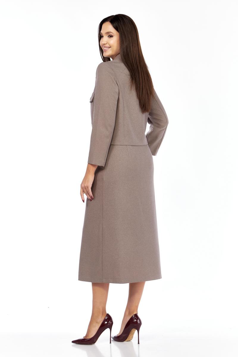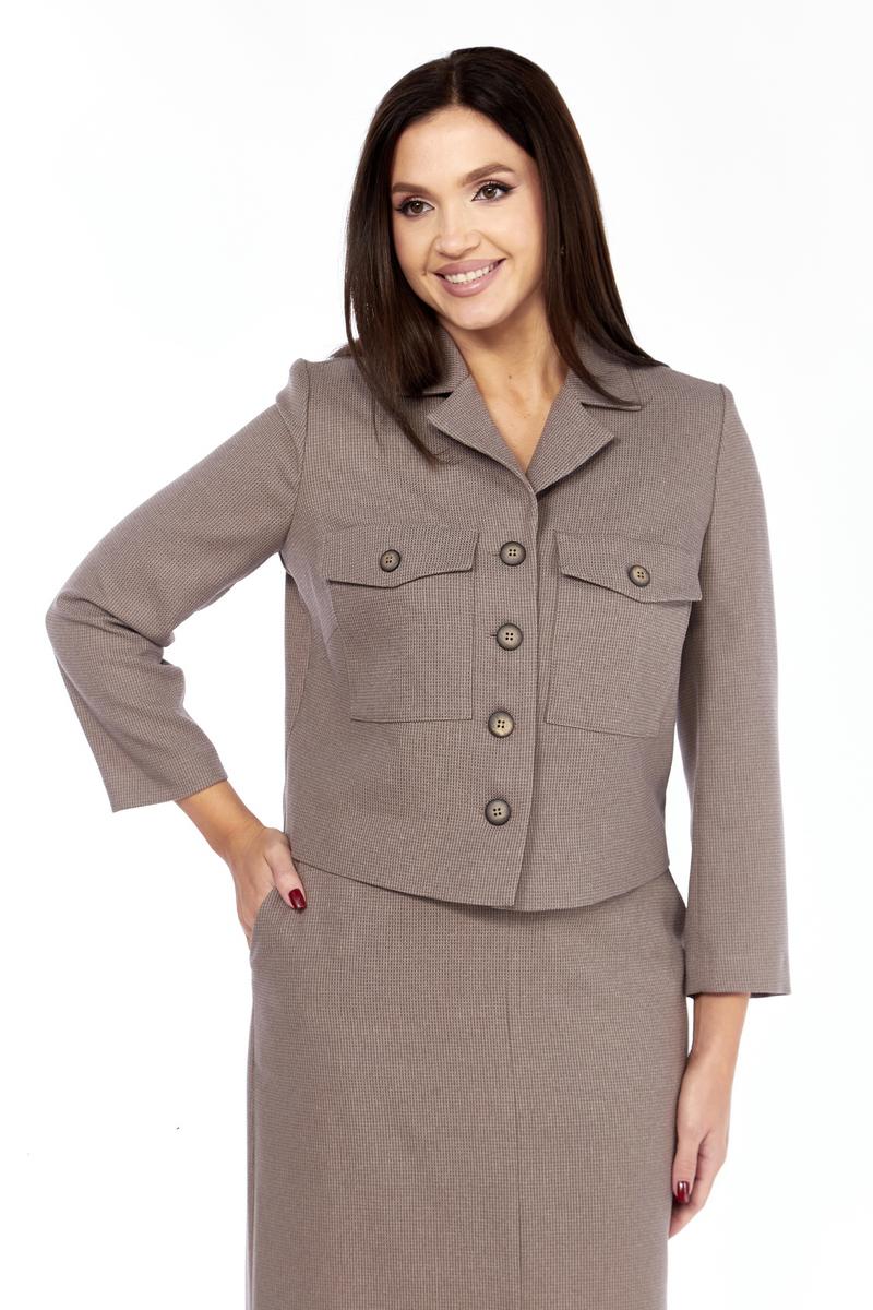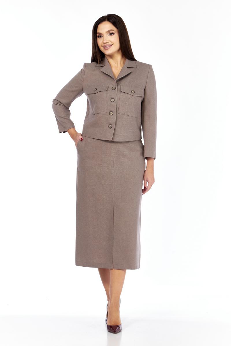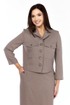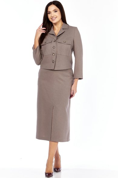Костюм женский состоящий из жакета и юбки. Жакет приталенного силуэта на подкладке спереди, со втачным рукавом длины ¾. Имеет отложной воротник с лацканами, по переду застежка на петли и пуговицы, на груди накладные карманы с клапанами, которые застегиваются на петлю и пуговицу.