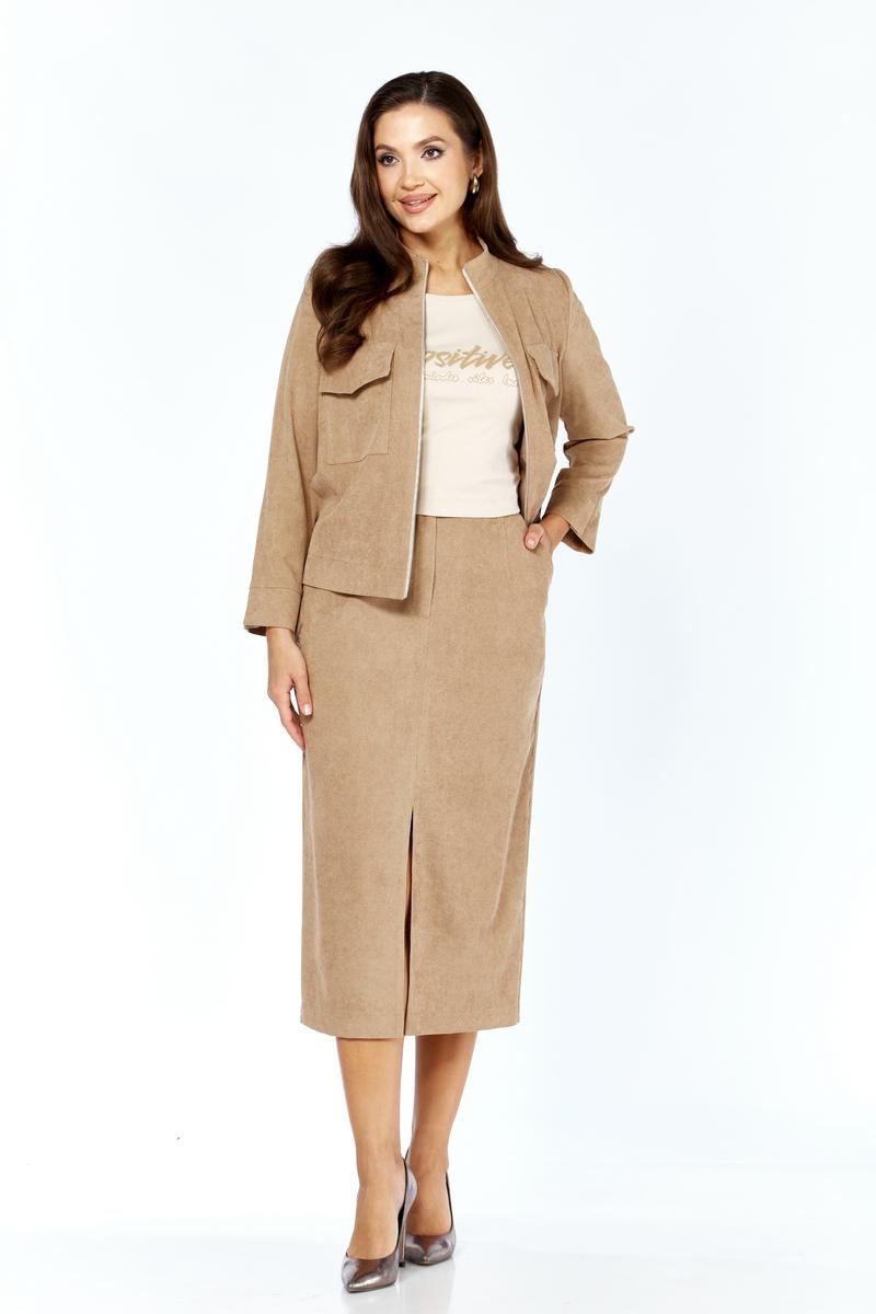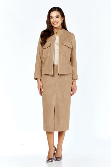 Костюм женский состоящий из жакета в спортивном стиле, юбки-карандаш и кроп-топа. Жакет без подкладки, с воротником-стойкой, застегивается на молнию до верха, со втачным рукавом длины 3/4, низ рукава заканчивается манжетой с разрезом. По переду куртки накладные карманы с клапаном. По спинке отрезная кокетка, низ спинки присборен на резинку.
