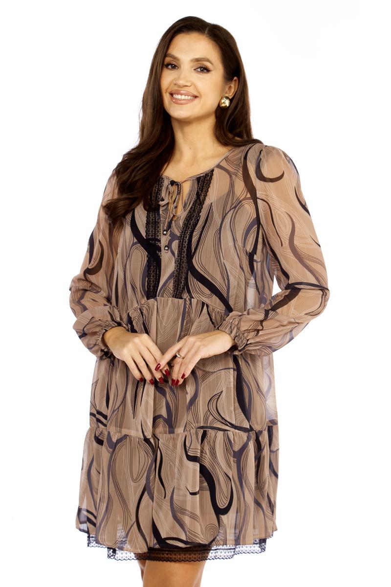 Платье женское свободного силуэта. Округлый вырез горловины, на завязках. Рукав втачной, со сборкой, по низу-на резинке. Изделие с подрезами, со сборкой. По спинке-декоративный вырез с кружевом. Нижний волан платье выполнен из сетки с кружевом. Подкладкой служит-нижнее платье на регулируемых бретелях. Длина по спинке-93см, длина рукава-63см.