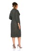 Платье женское полуприлегающего силуэта, без подкладки, отрезное по линии талии. Имеет V-образный вырез, отложной воротник и цельнокроеный рукав. На полочке до талии обработана застежка на петли и пуговицы, отрезная кокетка спереди переходит в рукав до его низа, на правом рукаве внизу имеется пришивной декоративный элемент. На груди – накладные карманы с клапаном застегиваются на петлю и пуговицу. Юбка платья слегка заужена к низу, имеет карманы-хулиганы и шов спереди, в котором обработан разрез для удобства ходьбы.