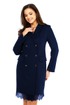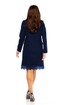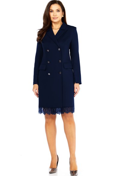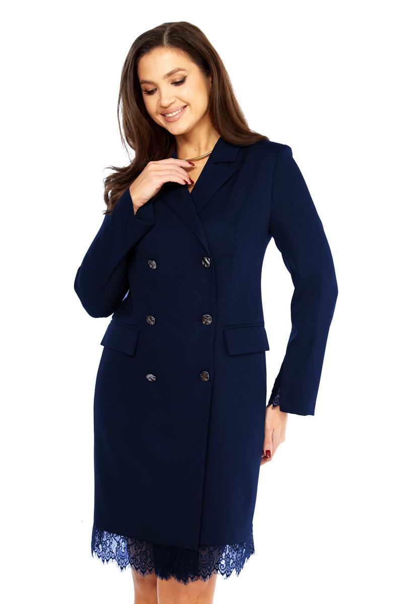 Двубортный жакет-платье, полуприлегающего силуэта, из костюмной ткани, без подкладки. Воротник-с отложными лацканами пиджачного типа, рукава – двухшовные. По переду – вытачки, прорезные карманы с клапанами и двумя листочками. Жакет имеет 6 пуговиц и одну потайную. По низу изделия и в шве рукава используется кружево, для придания романтизма классическому образу.