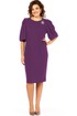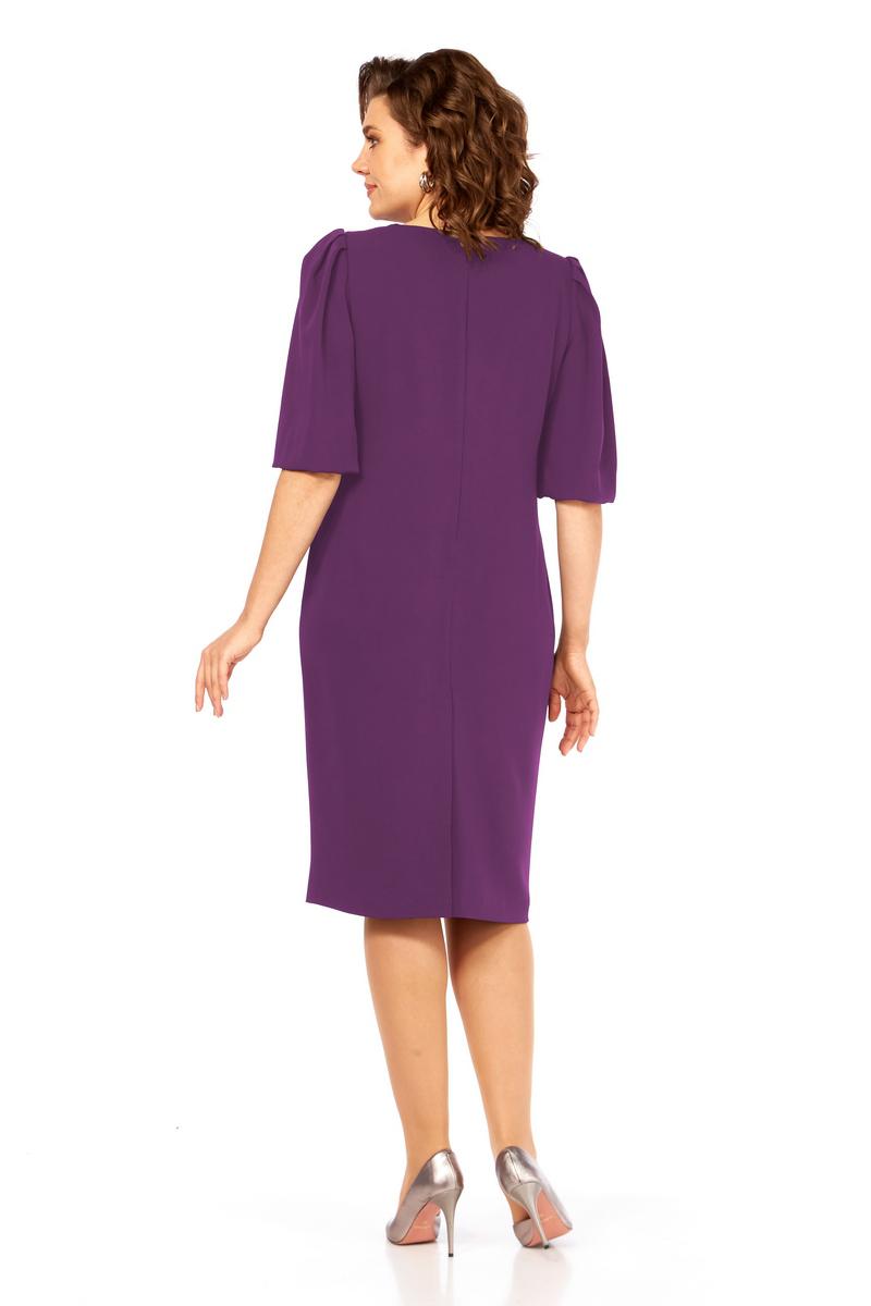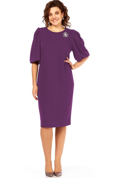 Платье-футляр, полуприлегающего силуэта, длины миди, без подкладки. Рукава – «фонарики», горловина круглая. Объемное украшение (брошь) пристегивается. По спинке шов, в котором обработана застежка-молния и шлица для удобства при ходьбе.