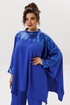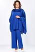 Стильный, женский комплект свободного покроя, выполнен из текстиля и пайеток, состоит из блузы и брюк. Блуза свободного покроя, горловина обработана стойкой из пайеток, по спинке с застежкой на петлю-пуговицу. Полочка и спинка с цельнокроеным рукавом. по низу обработан манжетой из пайеток. Также на полочке обработана кокетка из пайеток. по боковым швам блузы разрезы. Брюки свободного покроя, из основной ткани, верхний срез обработан притачным поясом на резинке и с застежкой на молнию, по поясу на пуговицу. На брюках, в боковых швах, выполнены карманы. Эффектный комплект, который отлично скрывает все нюансы  фигуры, просто находка для ценительниц яркого образа!