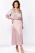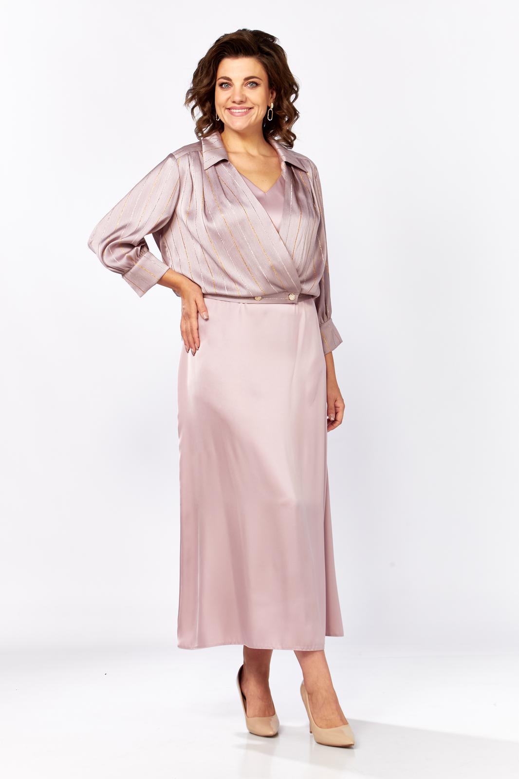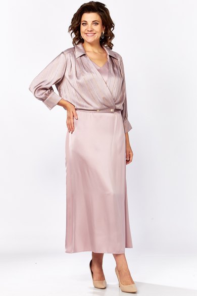 Женский комплект, состоит из платья и блузы, выполнен из однотонного атласа и атласа в полоску. Платье с V-образной горловиной, на обтачке, по переду обработаны нагрудные вытачки. Спинка со средним швом и вытачками, рукав цельнокроеный, немного спущенный по линии плеча. Блуза свободного покроя, из атласа в полоску, по линии талии с притачным поясом из атласа в полоску. По спинке в пояс вставлена резинка для удобства регулировки на любой тип фигуры, горловина на обтачке, обработана воротником. Лиф платья с кокеткой по линии плеча, от линии кокетки заложены складки, по низу лиф присборен на пос. Спинка также свободного покроя, присборена по низу на пояс. Рукав втачной, длиной 3/4, по низу присборен на широкий манжет, на манжете застежка на петлю-пуговицу. Эффектный и стильный комплект выполненный в трендовых расцветках сделает ваш образ элегантным на любом мероприятии!