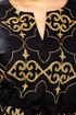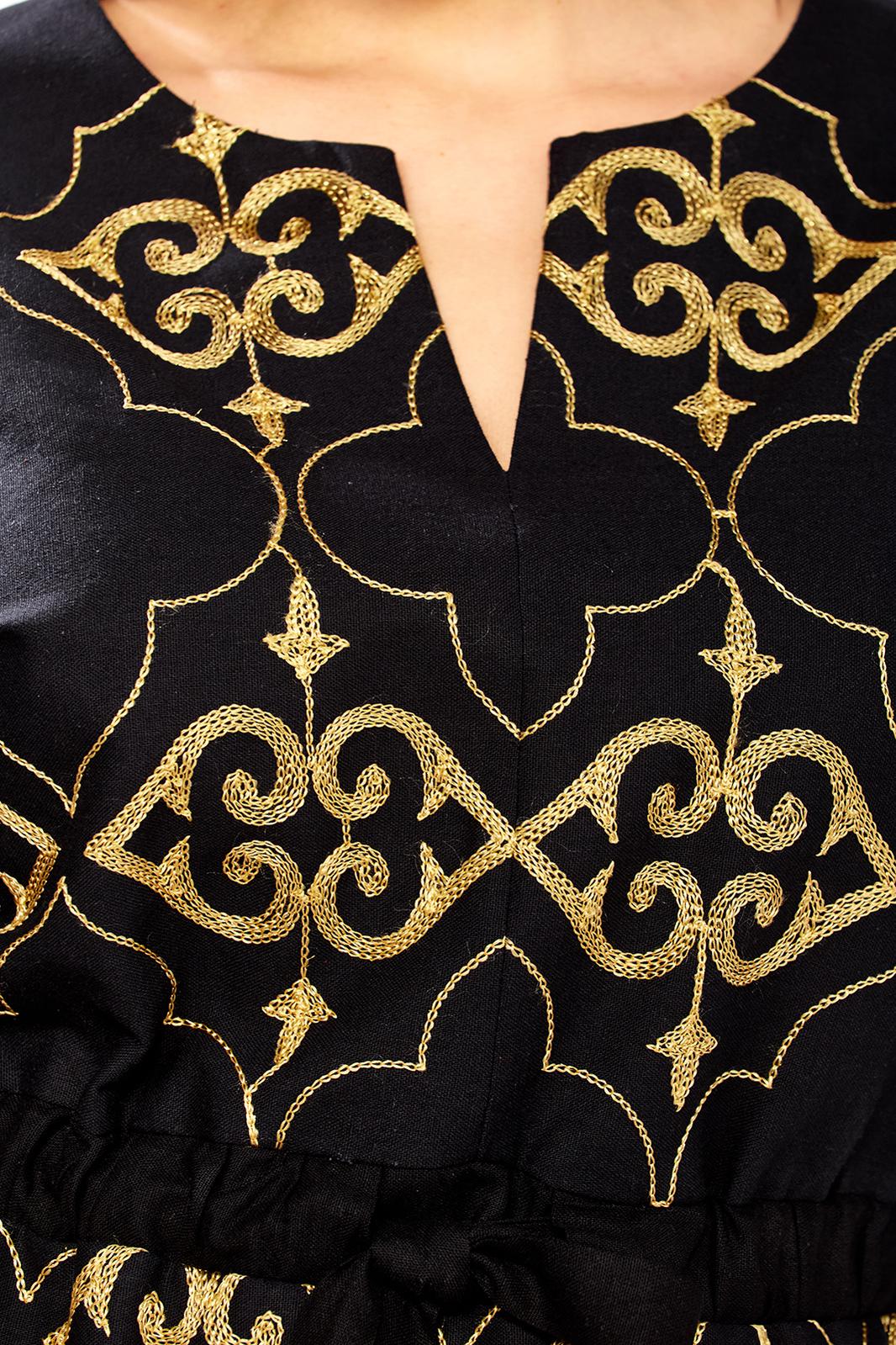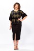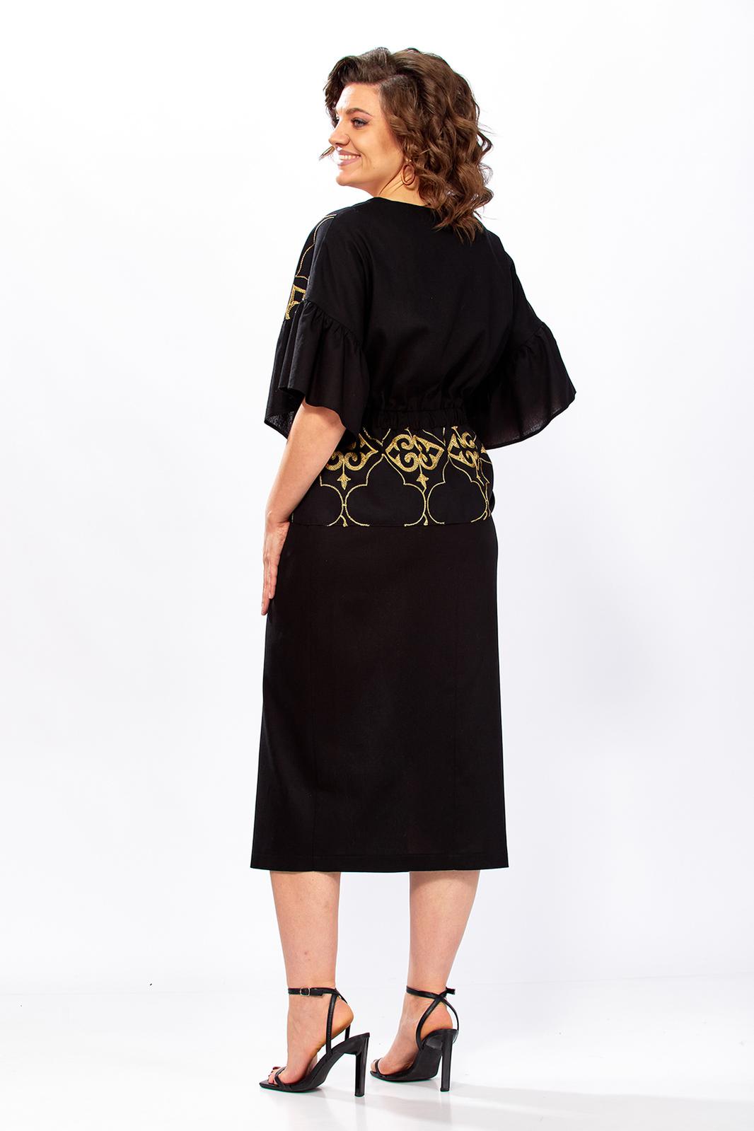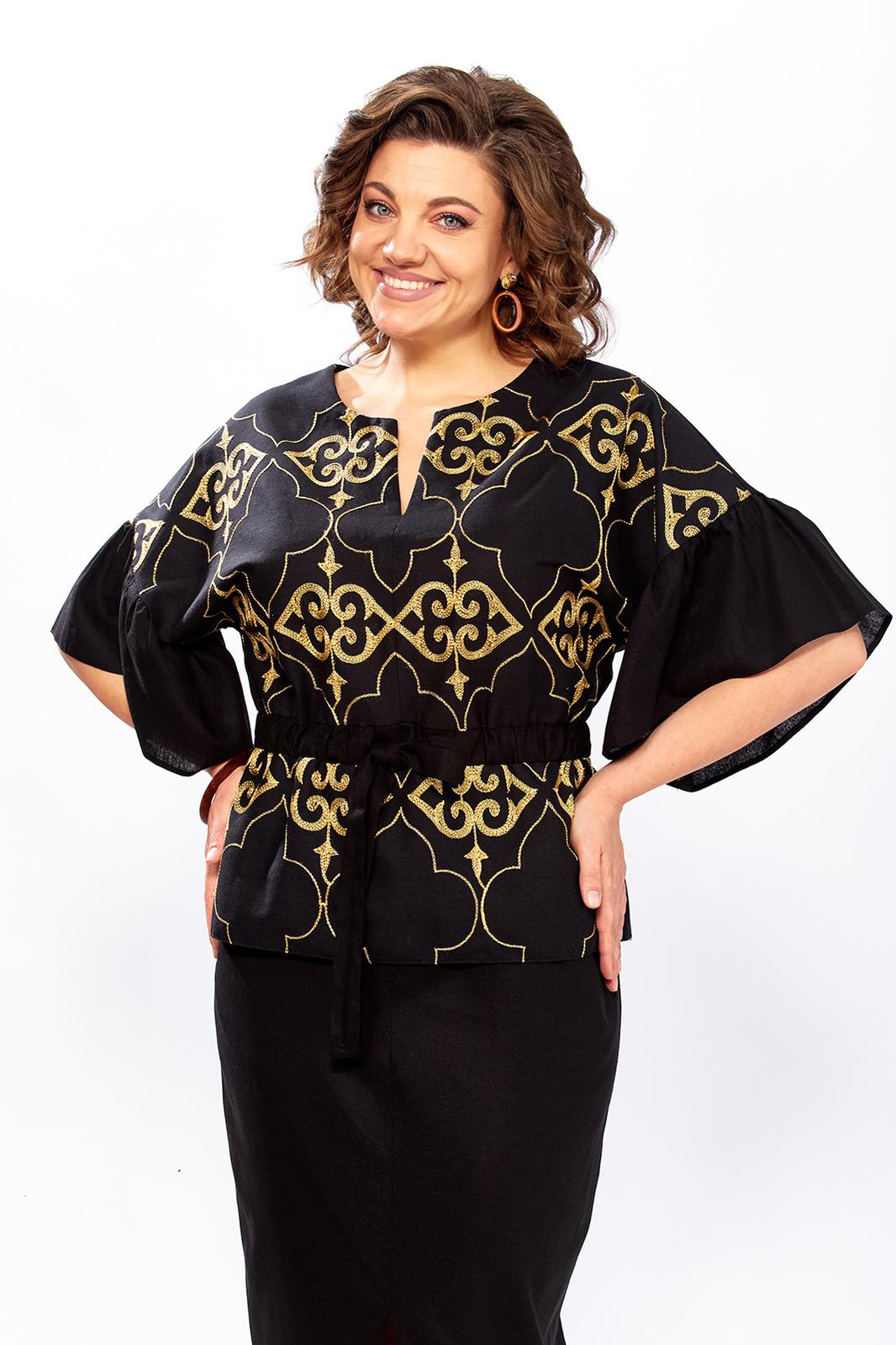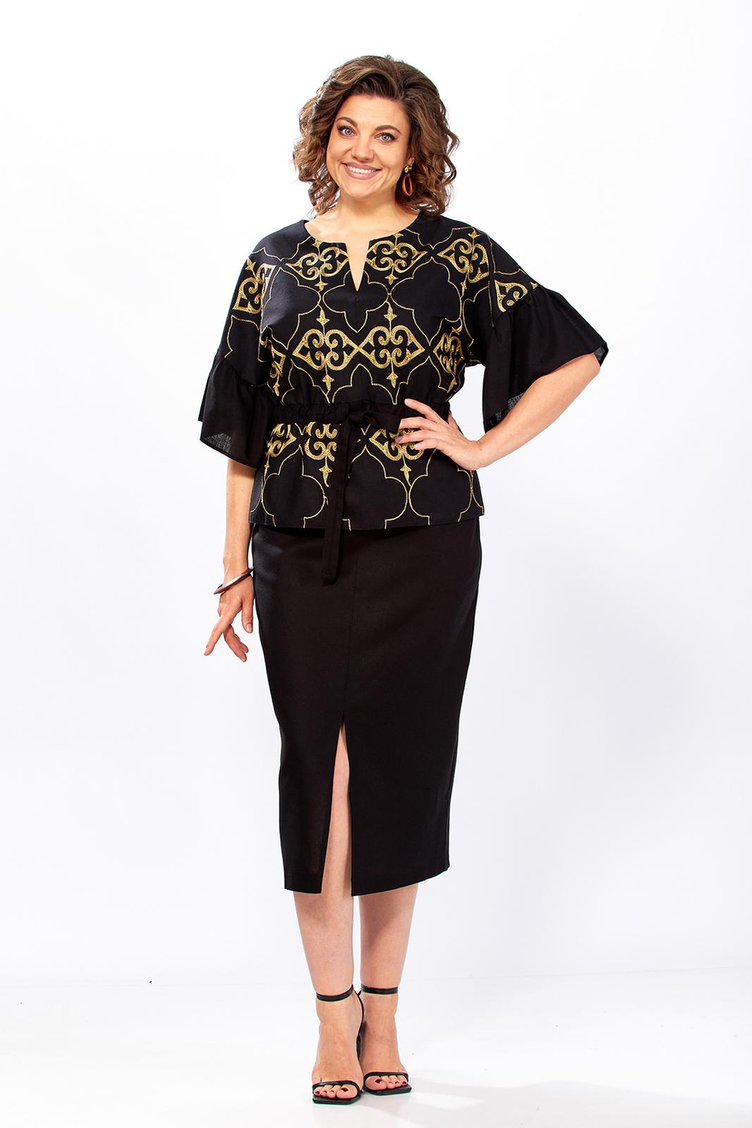 Женский комплект полу-прилегающего силуэта, состоит из блузы и юбки, выполнен из однотонного льна и льна с вышивкой. Блуза свободного покроя, прилегание по талии регулируется при помощи кулисы, можно как заузить изделие по талии, так и немного расслабить. Также на полочке обработана горловина округлой формы, с обтачным разрезом посередине. Полочка выполнена из льна с вышивкой, кулиса по линии талии из однотонного льна. Спинка идентична полочке, выполнена из однотонного льна, баска из льна с вышивкой. Рукав цельнокроеный, укороченный, по низу притачен широкий манжет, присборенный по линии притачивания, выполнен из однотонного льна. Юбка прямого силуэта, выполнена из однотонного льна, по переднему полотнищу выполнен вертикальный подрез, по низу обработан разрез. Верхний срез обработан поясом с резинкой, застежка по переду на молнию и петлю-пуговицу. Эффектный костюм с яркой вышивкой золотом может использоваться не только как повседневный комплект, но и прекрасно подойдет для торжеств и мероприятий!