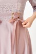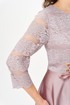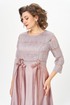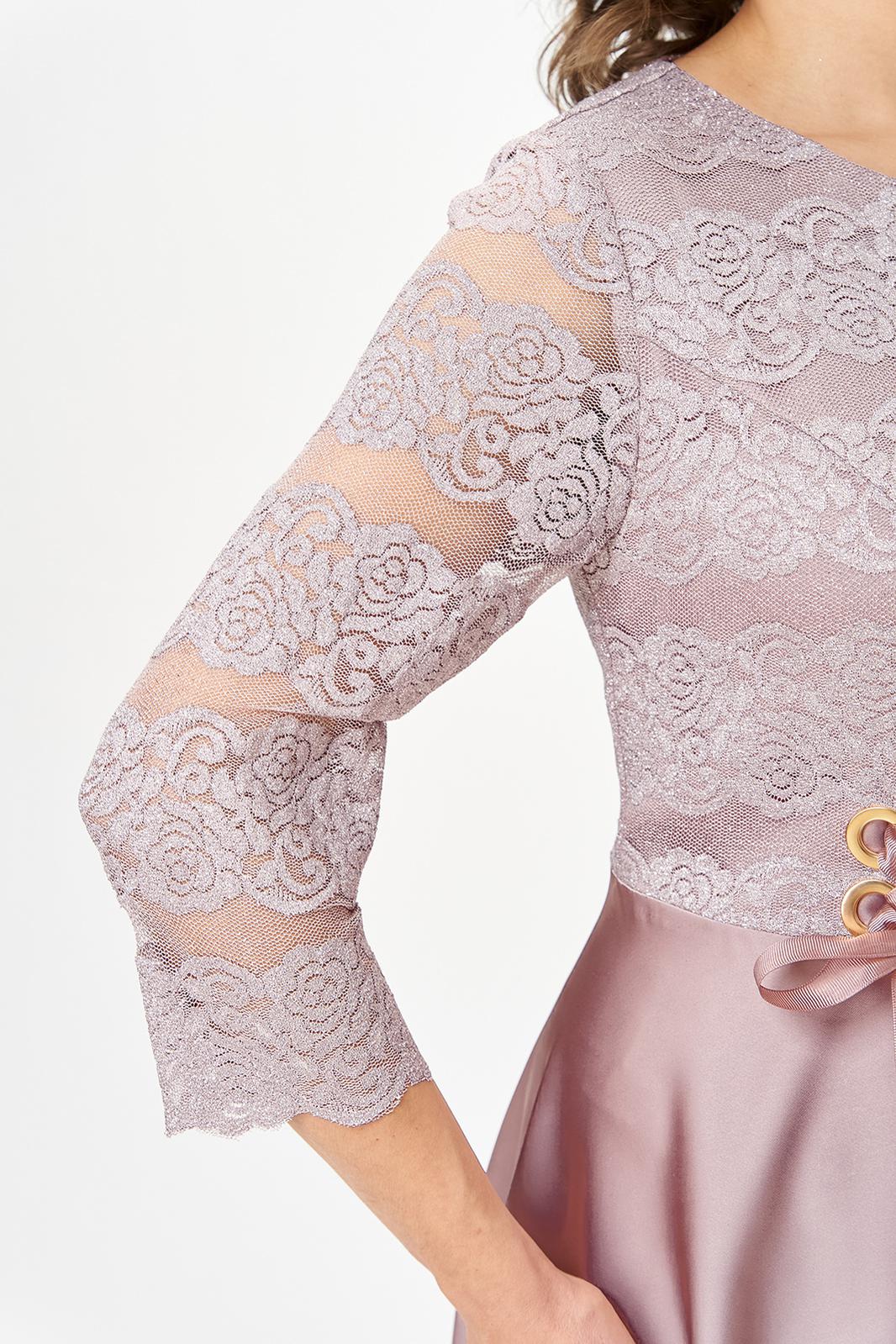 Нарядное женское платье полу-прилегающего силуэта, выполнено из гипюра с глитером и атласа. Лиф платья отрезной по линии талии, выполнен из гипюра с глитером. Горловина платья округлой формы, на обтачке, на полочке выполнены рельефы, по рельефам обработаны люверсы с декоративной лентой. Юбка платья расклешенного силуэта, из атласа, спинка идентична полочке, со средним швом и рельефами, в среднем шве потайная молния. Рукав втачной, оптимальной длины, выполнен из гипюра с глитером. Нарядное платье отличный выбор для торжественных мероприятий!