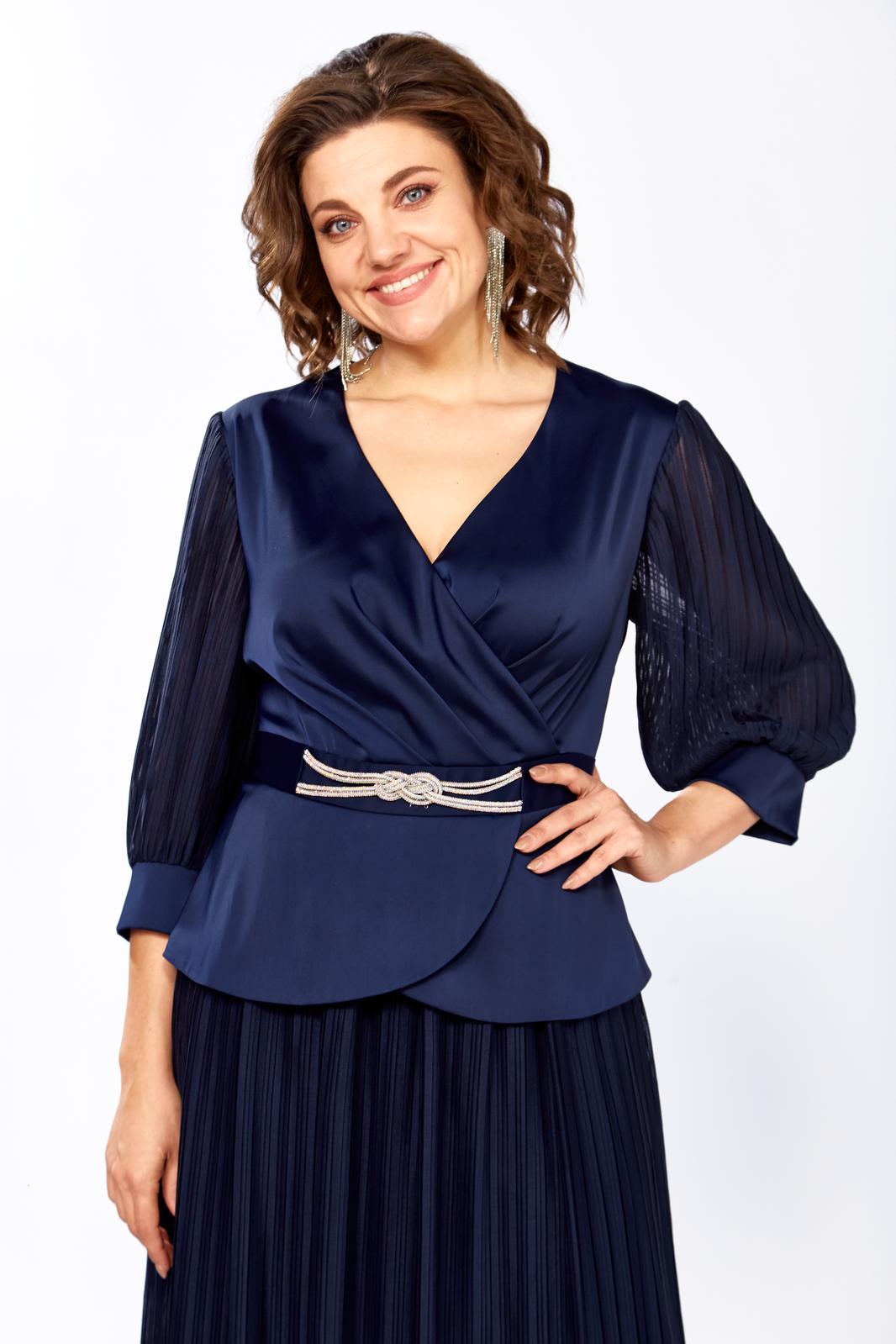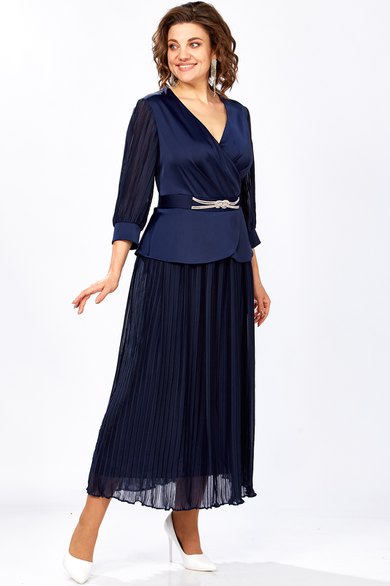 Нарядное женское платье, полу-прилегающего силуэта, выполнено из атласа и плиссированной ткани. Лиф платья выполнен из атласа, отрезной по линии талии, с втачным поясом, пояс декорирован элементом из страз. Горловина V-образной формы, на обтачке, лиф платья с имитацией запаха, по линии талии заложены складки. Юбка платья выполнена из плиссированной ткани, также на юбке от линии пояса обработан отлетная баска из атласа. Спинка идентична полочке, отрезная по линии талии, со средним швом и вытачками, в среднем шве потайная молния. Рукав втачной, выполнен из плиссированной ткани, по низу присборен на манжет. Эффектное и стильное платье отличный выбор для любого мероприятия!