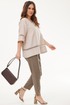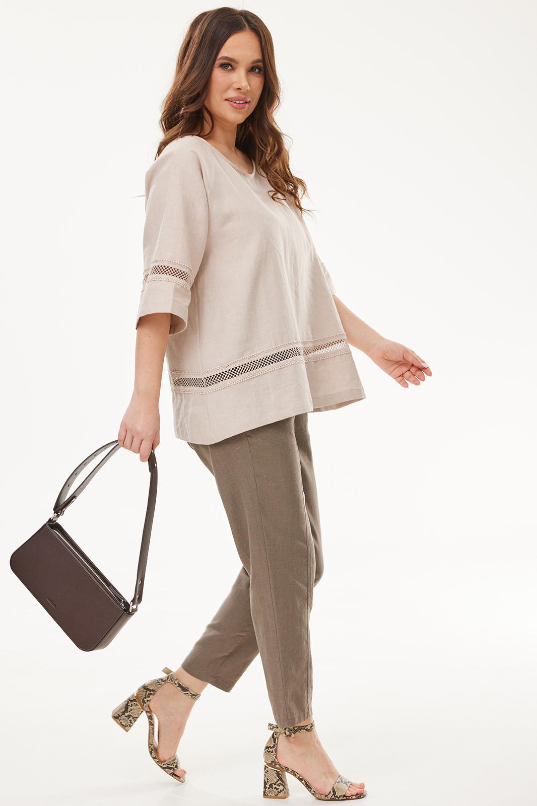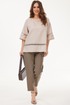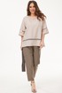 Комплект 2-ух предметный состоит из Туники м 1179 и Брюк м 1255. Туника изготовлена из качественного мягкого льна с эффектом мятости свободного силуэта с рукавом -реглан.Горловина оканотована. По низу изделия и по низу рукава- отделка тесьма-шитьё из хлопка.
