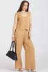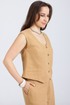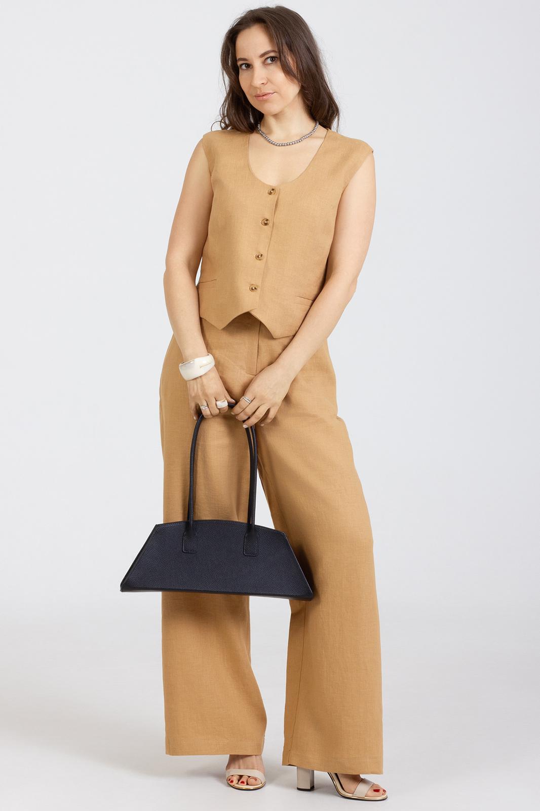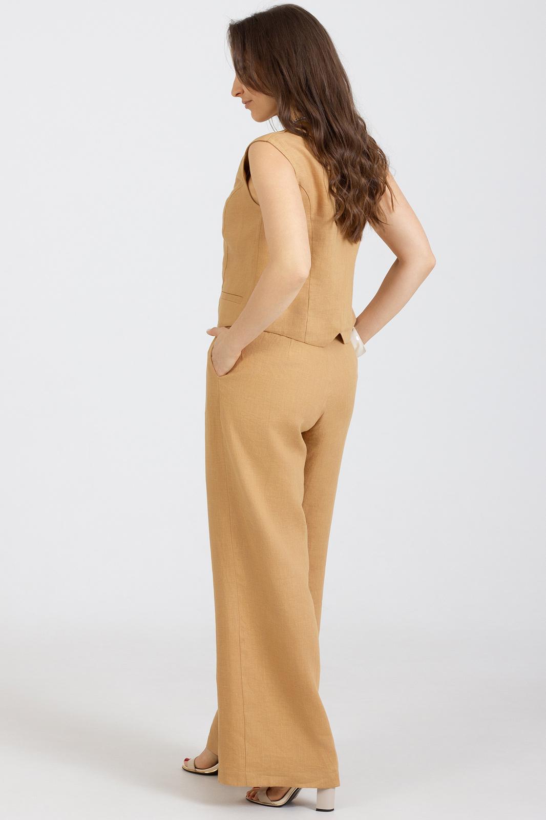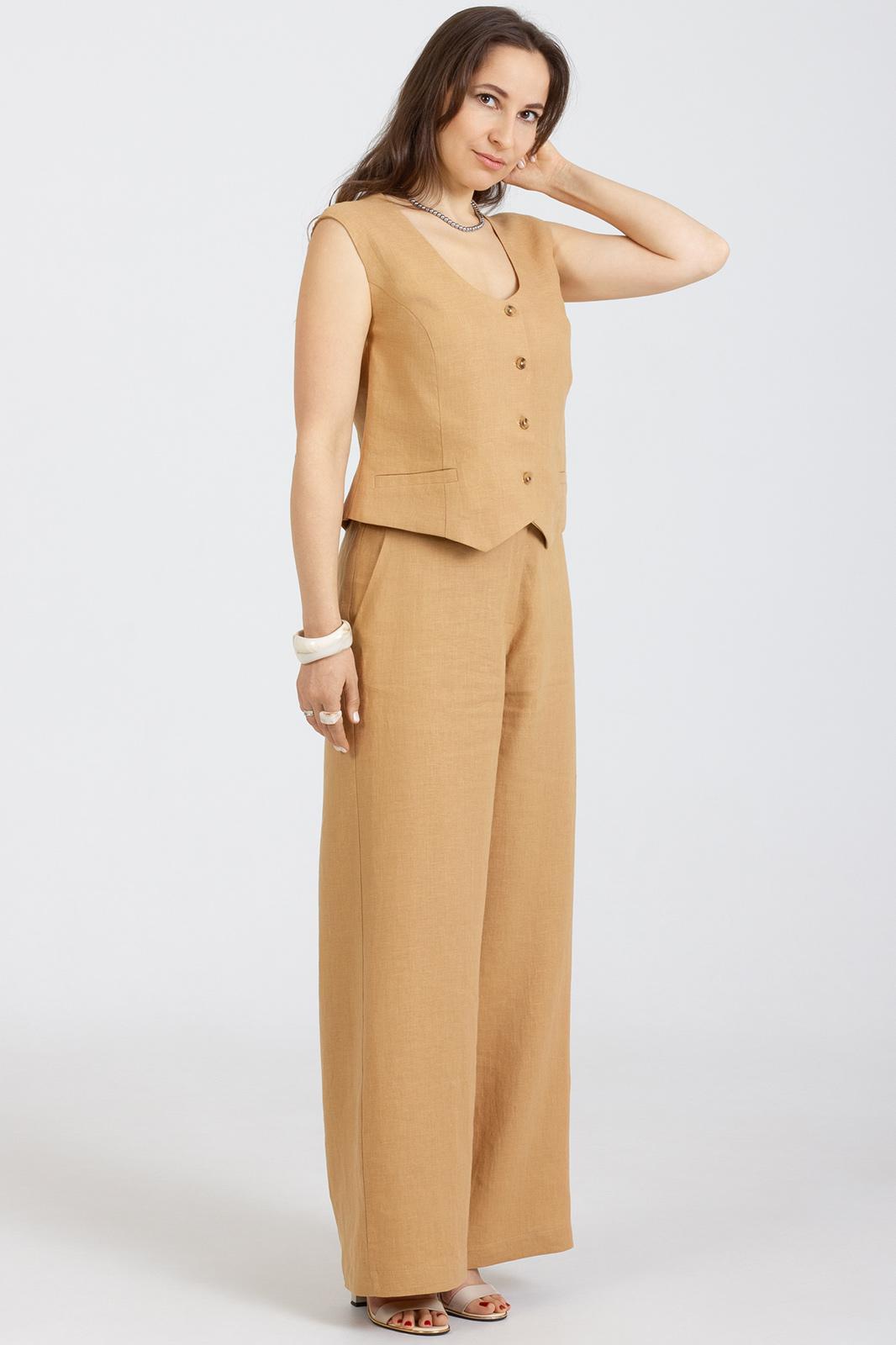 Комплект 2-ух предметный, из натурального мягкого льна с эффектом мятости состоит из Жилета и Брюк. Жилет укороченный полуприлегающего силуэта, передняя и задняя часть с рельефами, застёгивается на 4 петли и пуговицы, по переду карман в рамку.