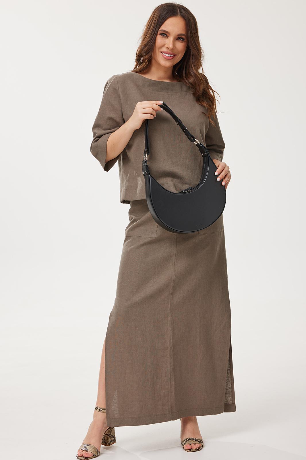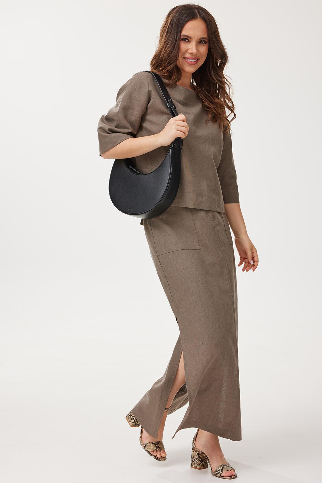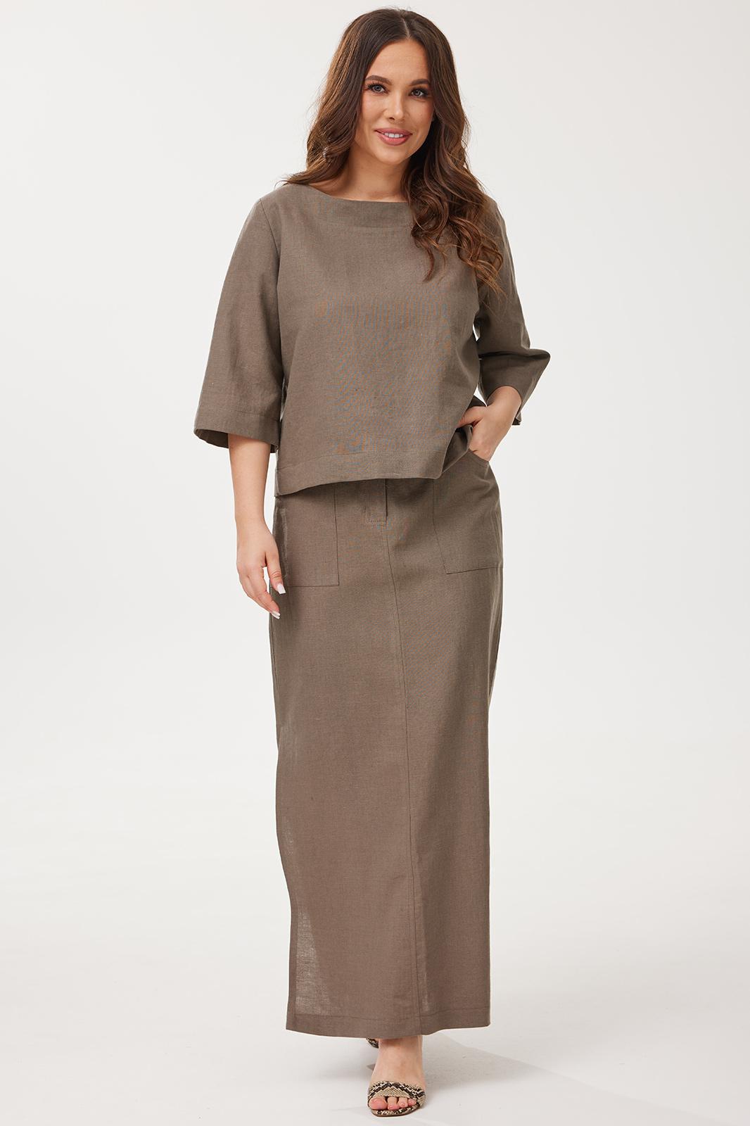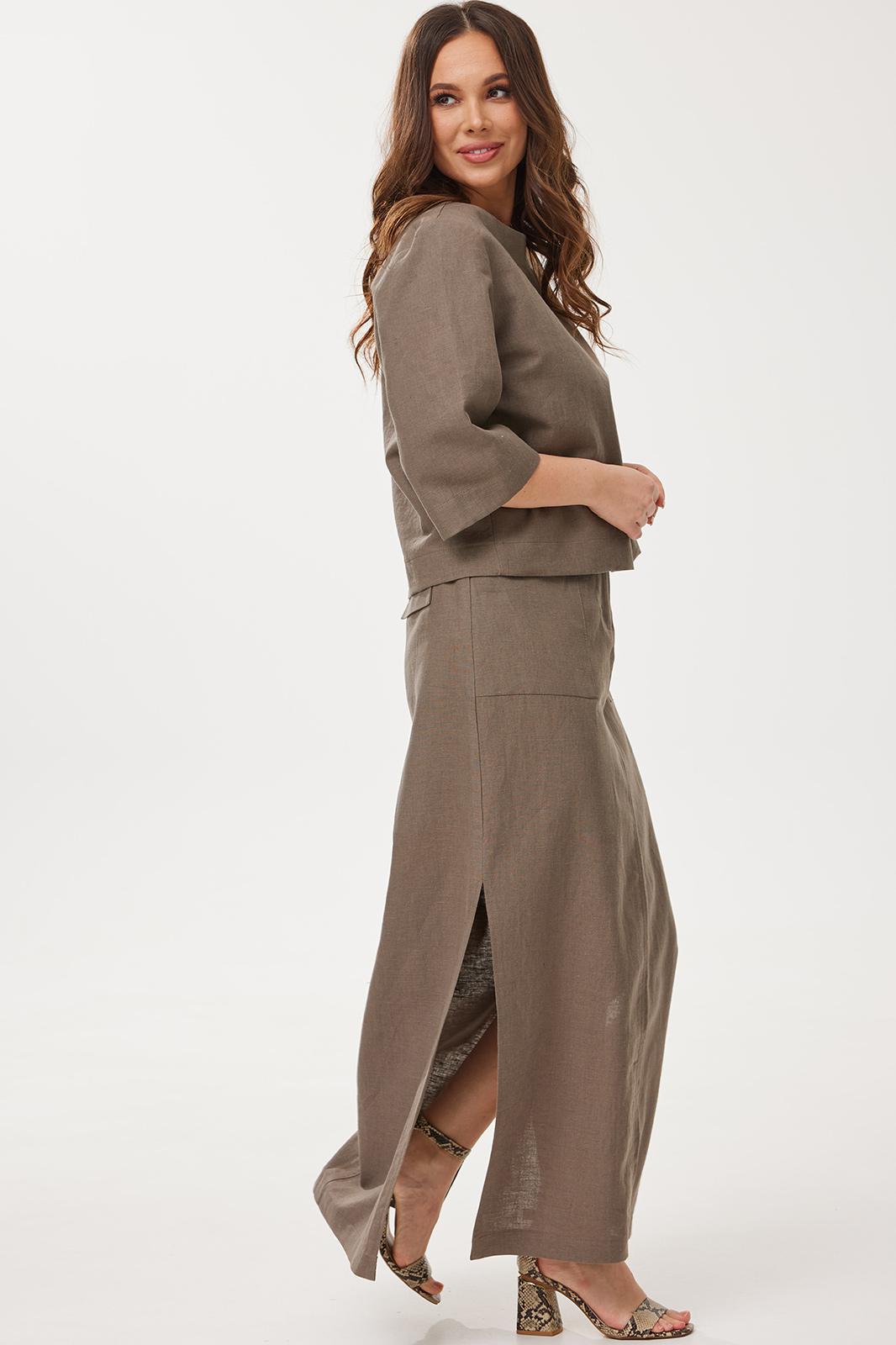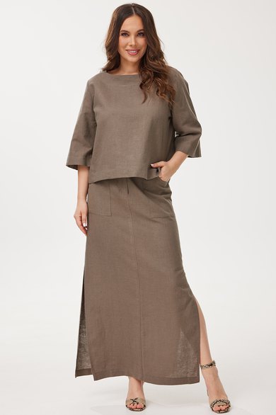 Комплект 2-ух предметный состоит из Блузки м 1245 и Юбки м 1249. Блузка укороченная свободного силуэта с втачным рукавом 3\4 из качественного мягкого льна с эффектом мятости . Классический вырез лодочка.