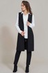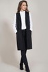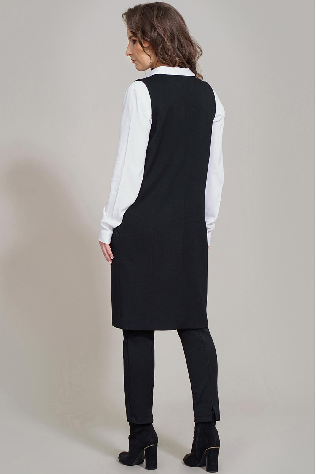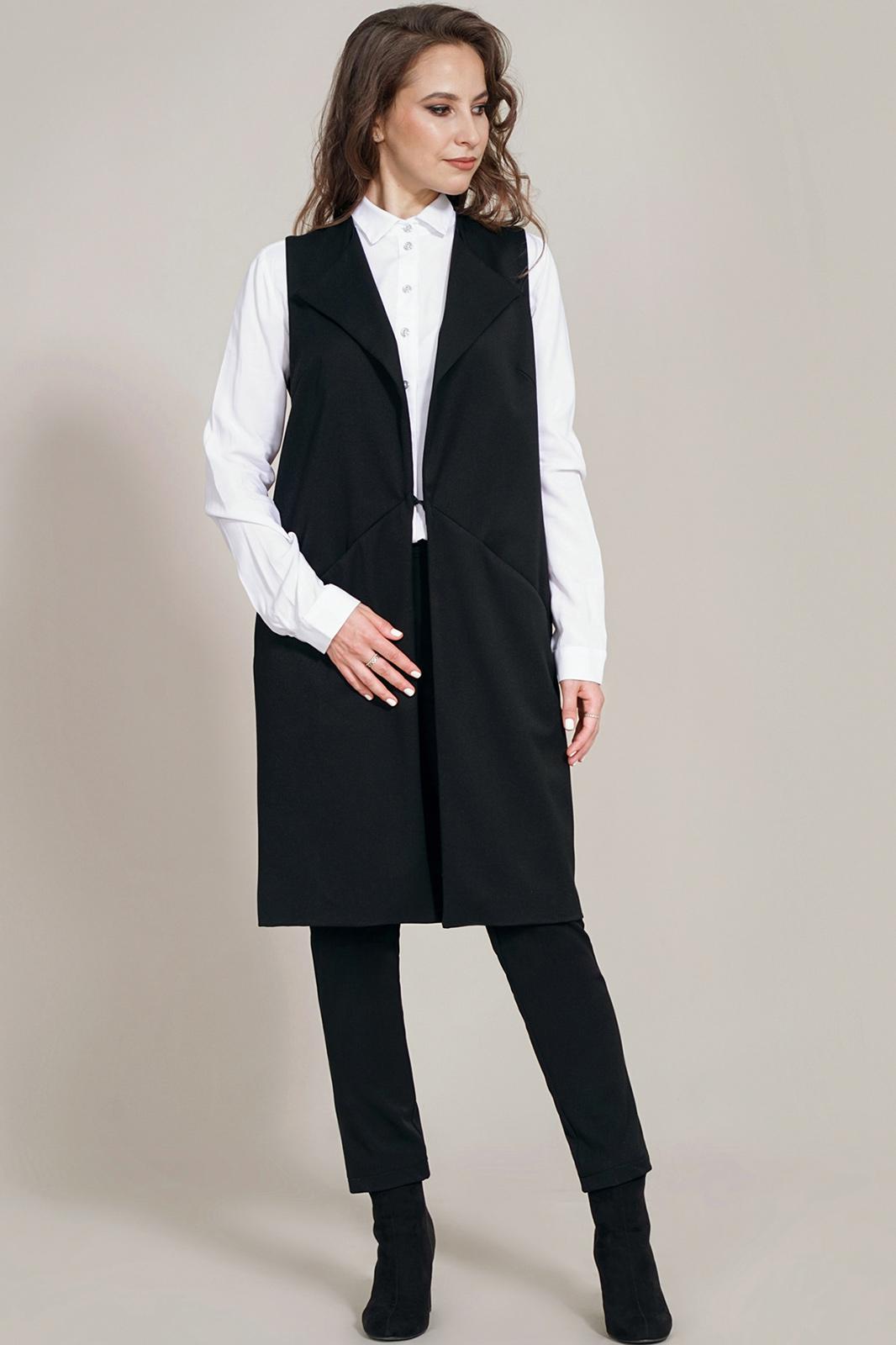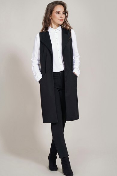 Жилет свободного прямого кроя с отложными лацканами , большими внутренними карманами по переду. Застёгивается внутри на петлю- пуговицу . Жилет на подкладке.