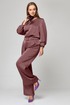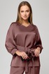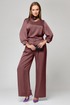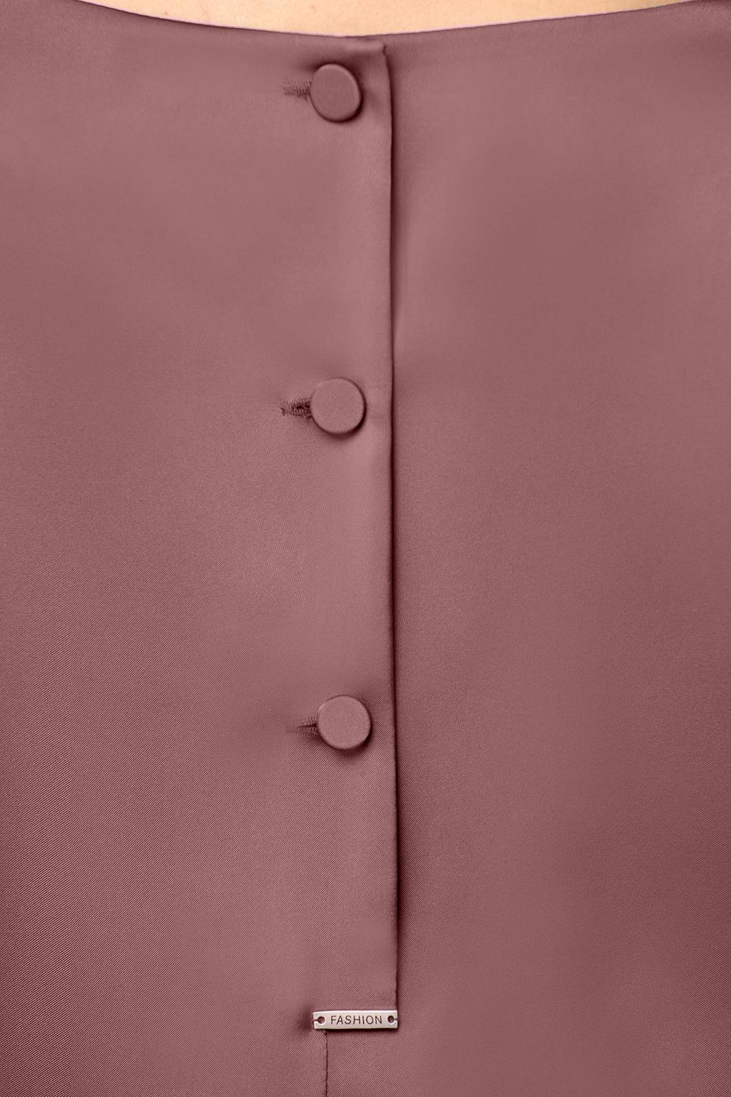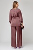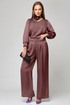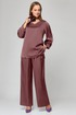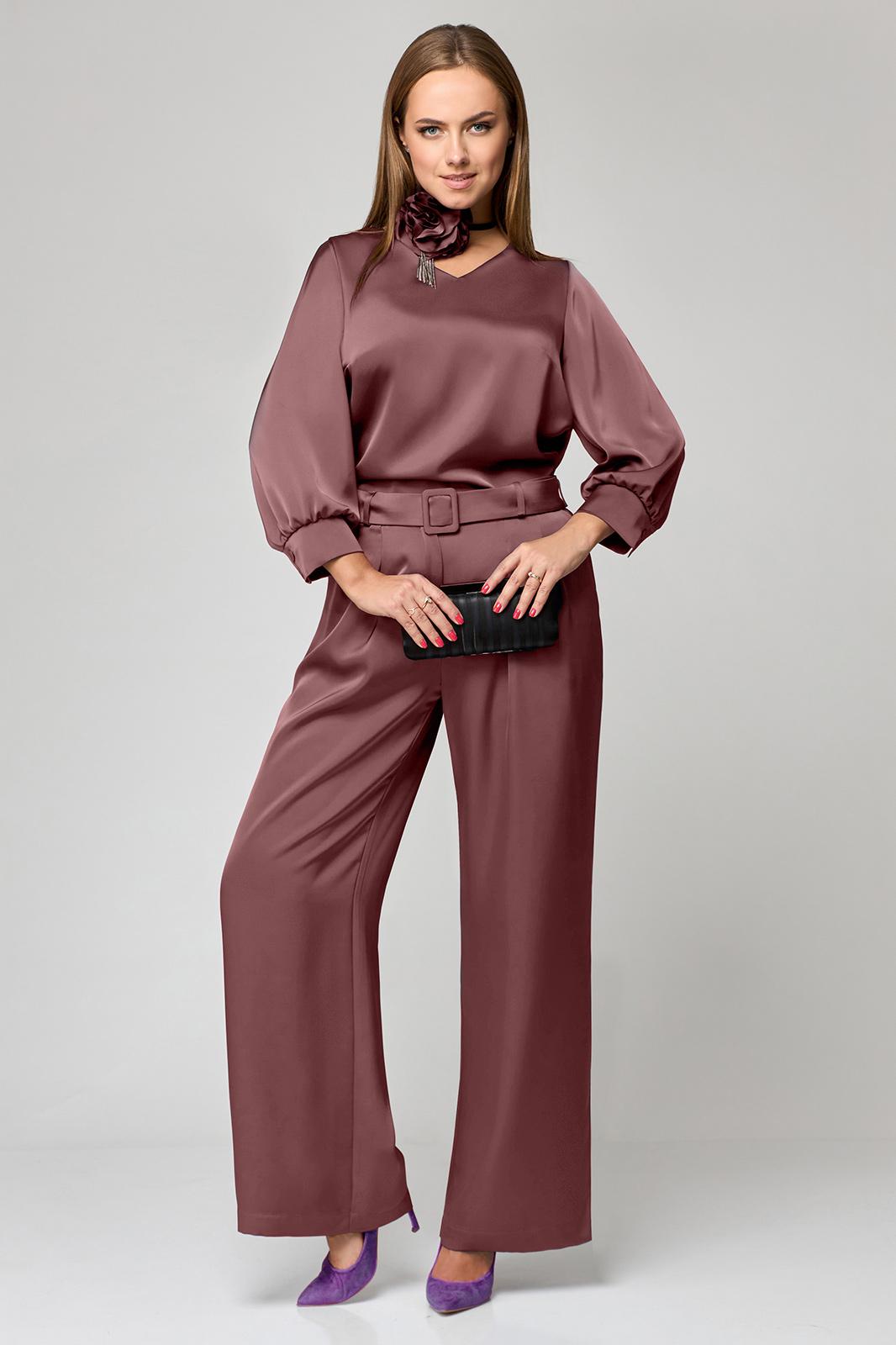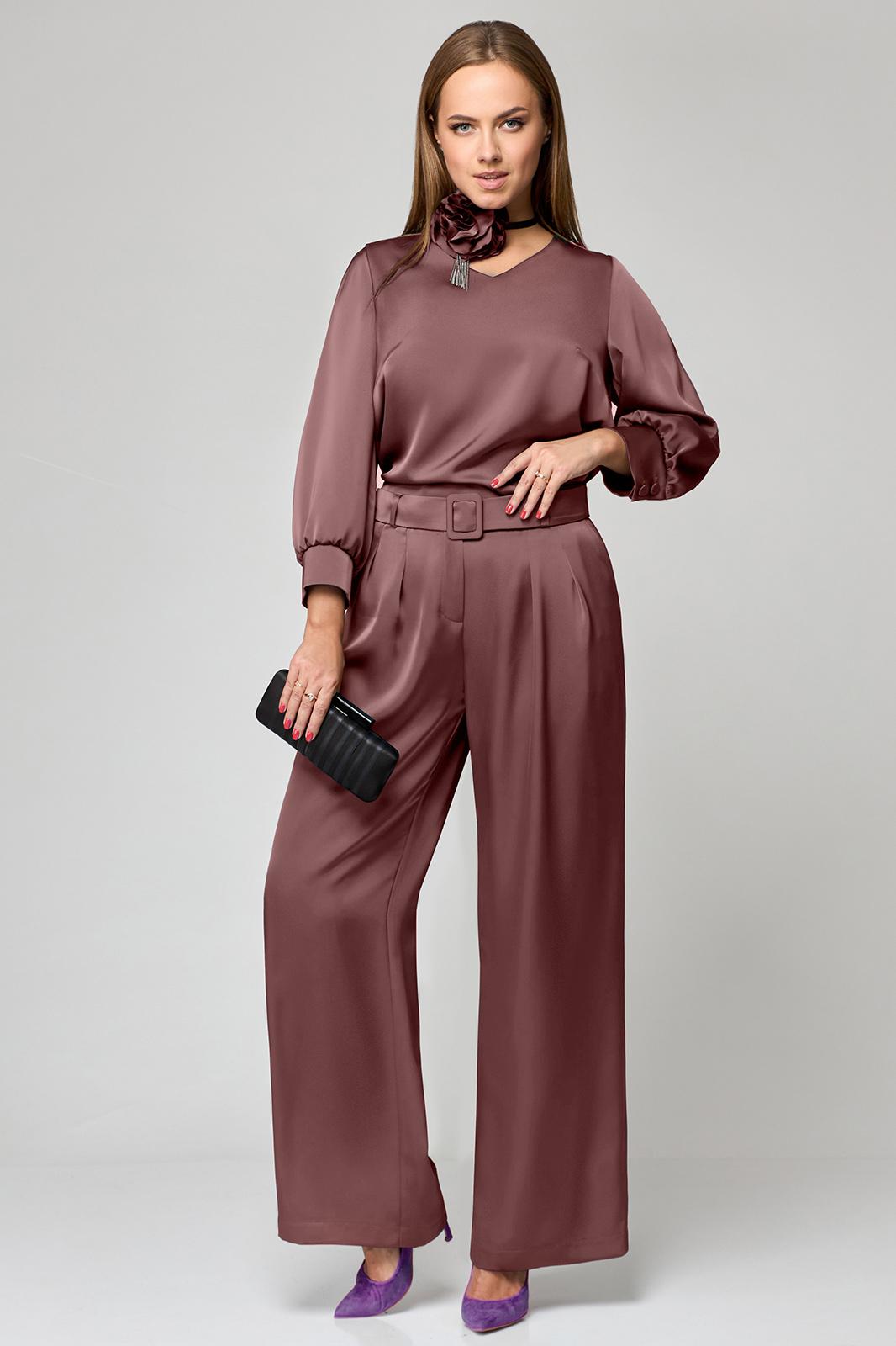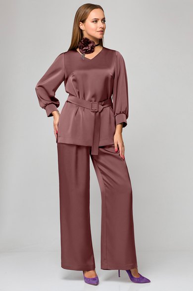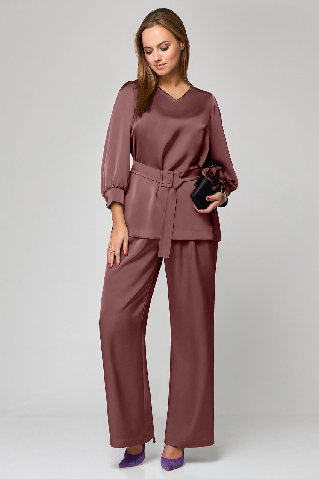 Комплект женский двухпредметный. Блузка - прямого силуэта с V-образным вырезом горловины. По спинке застежка на 3-петли и пуговицы. В боковых швах разрезы. Рукав втачной со складкой по низу с манжетой. Брюки классического покроя, прямые от бедра. В боковых швах карманы с отрезными бочками. Пояс отрезной со шлевками. Застежка на молнию и петлю с пуговицей. Изделие дополнено съемным поясом из основной ткани на пряжке. Длина блузки 69 см, длина рукава 52 см, длина брюк 106 см. Украшение в комплект не входит.