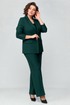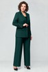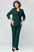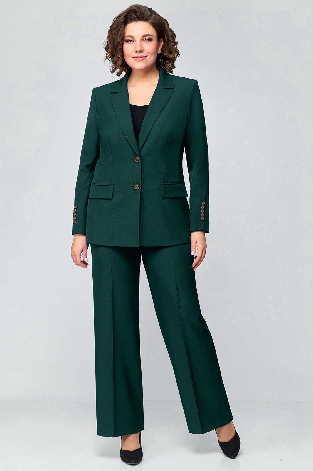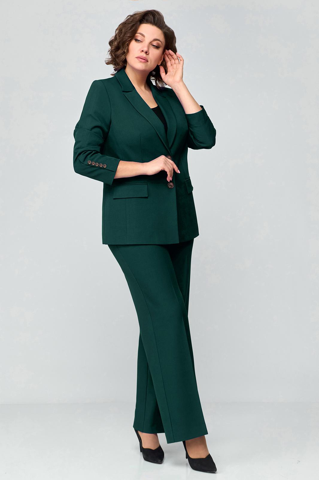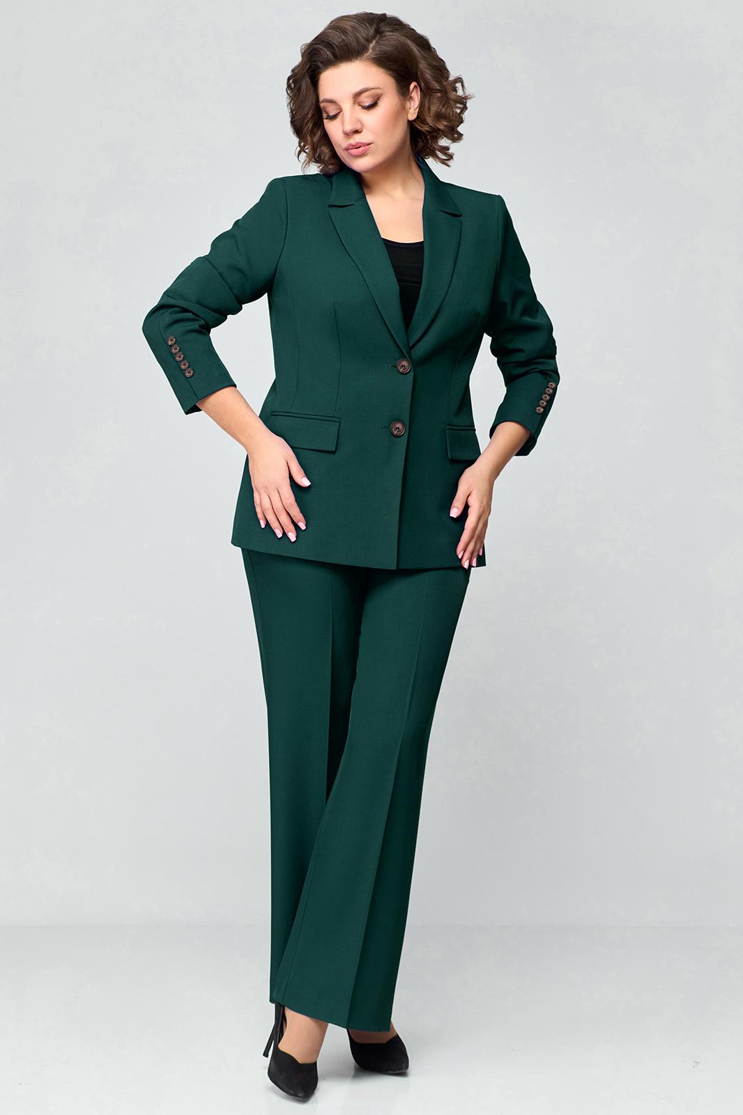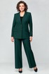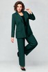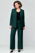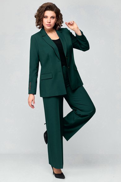 Комплект двухпредметный состоит из жакета и брюк. Жакет на подкладке с центральной застежкой на 2 петли и пуговицы с воротником пиджачного типа. По переду функциональными карманами с клапаном. Спинка с рельефом выходящим из проймы и средним швом. Рукав втачной с декоративным швом по середине рукава переходящим в шлицу. Шлица декорирована 5-ю пуговицами. Брюки прямые от бедра с боковыми карманами. Пояс на резинке по спинке. Костюм двойка отлично подойдет для офиса, для праздника, на каждый день для прогулок.