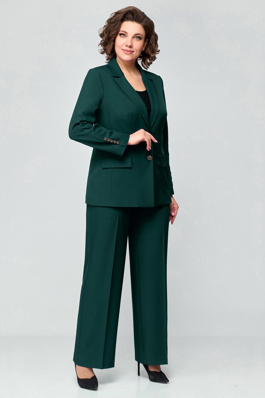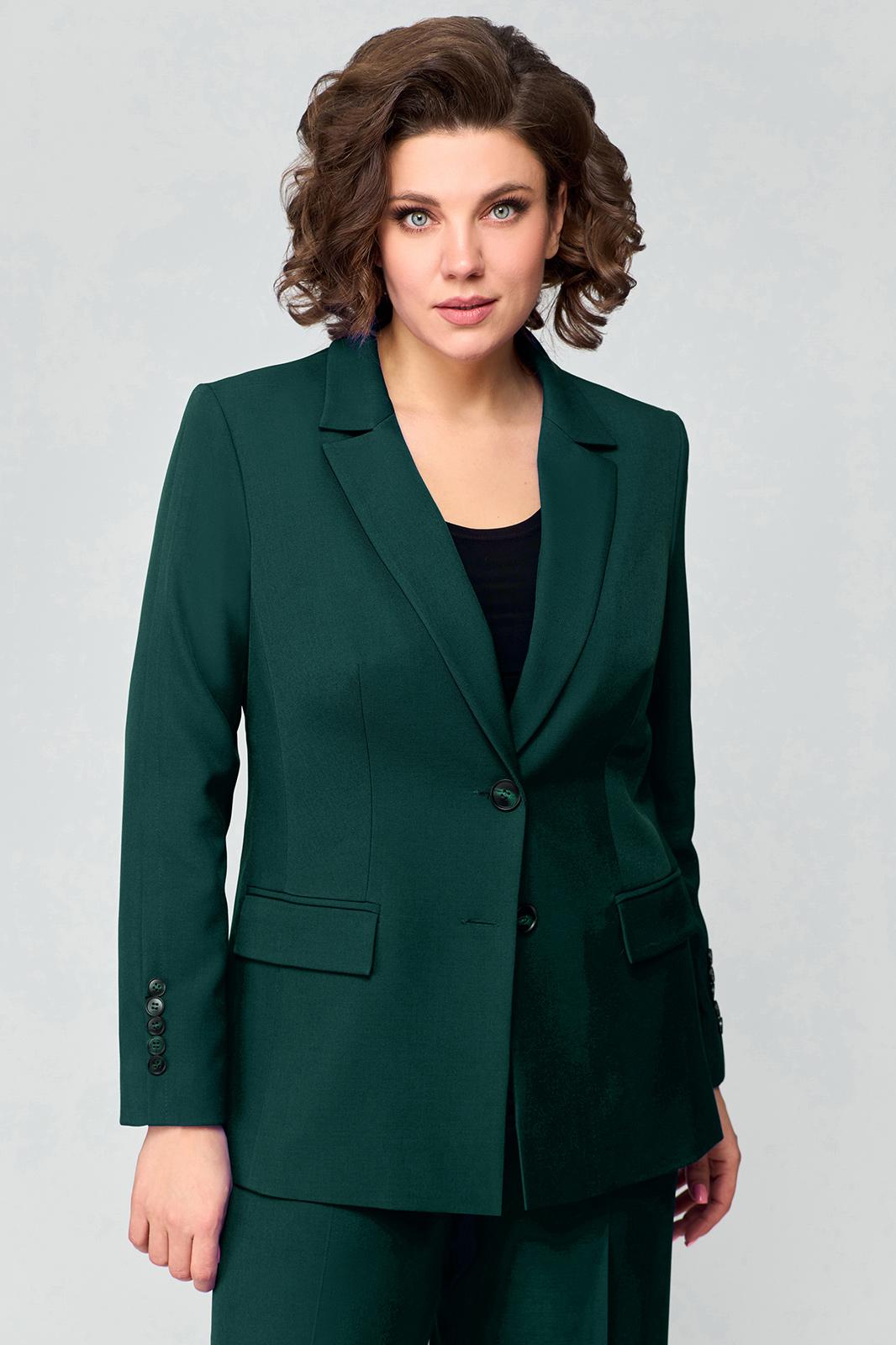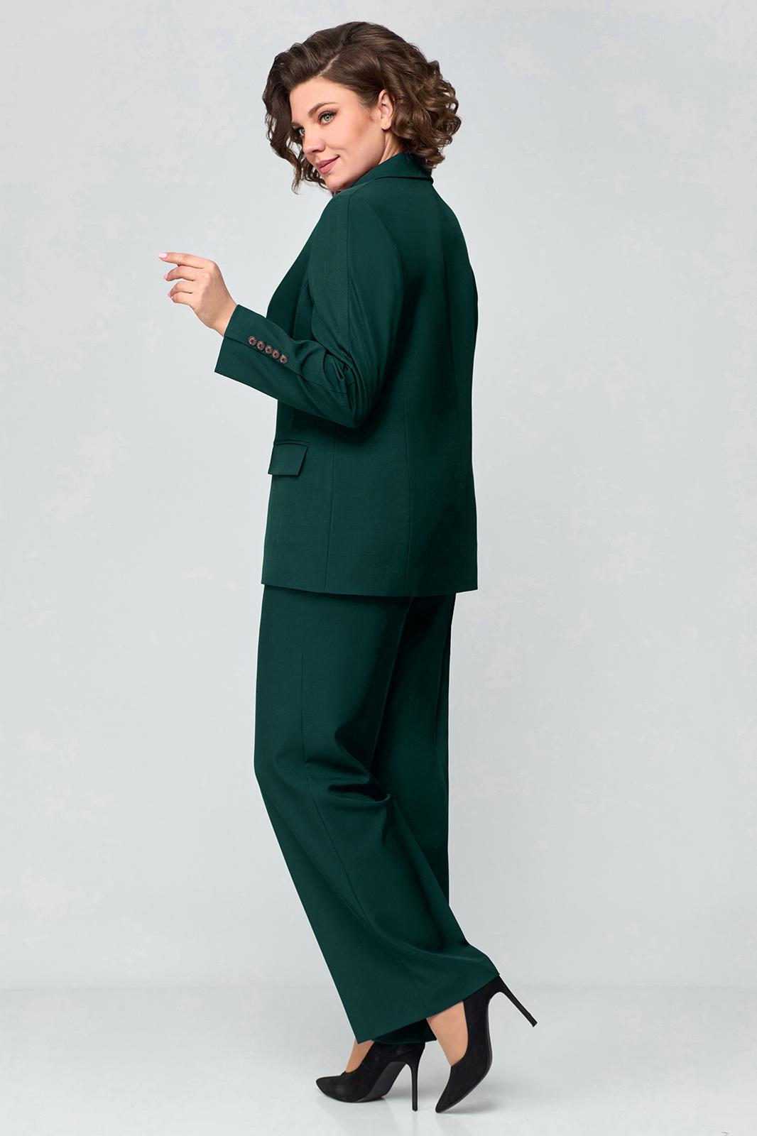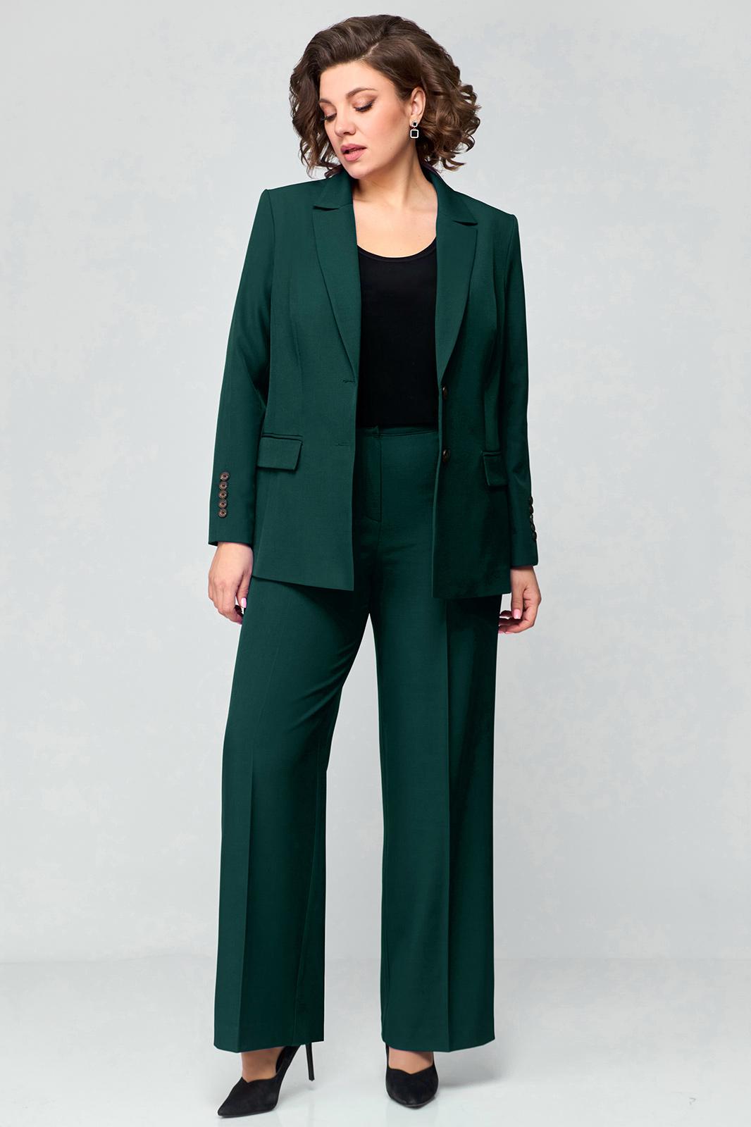 Комплект двухпредметный состоит из жакета и брюк. Жакет на подкладке с центральной застежкой на 2 петли и пуговицы с воротником пиджачного типа. По переду функциональными карманами с клапаном. Спинка с рельефом выходящим из проймы и средним швом. Рукав втачной с декоративным швом по середине рукава переходящим в шлицу. Шлица декорирована 5-ю пуговицами. Брюки прямые от бедра с боковыми карманами. Пояс на резинке по спинке. Костюм двойка отлично подойдет для офиса, для праздника, на каждый день для прогулок.