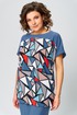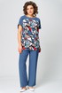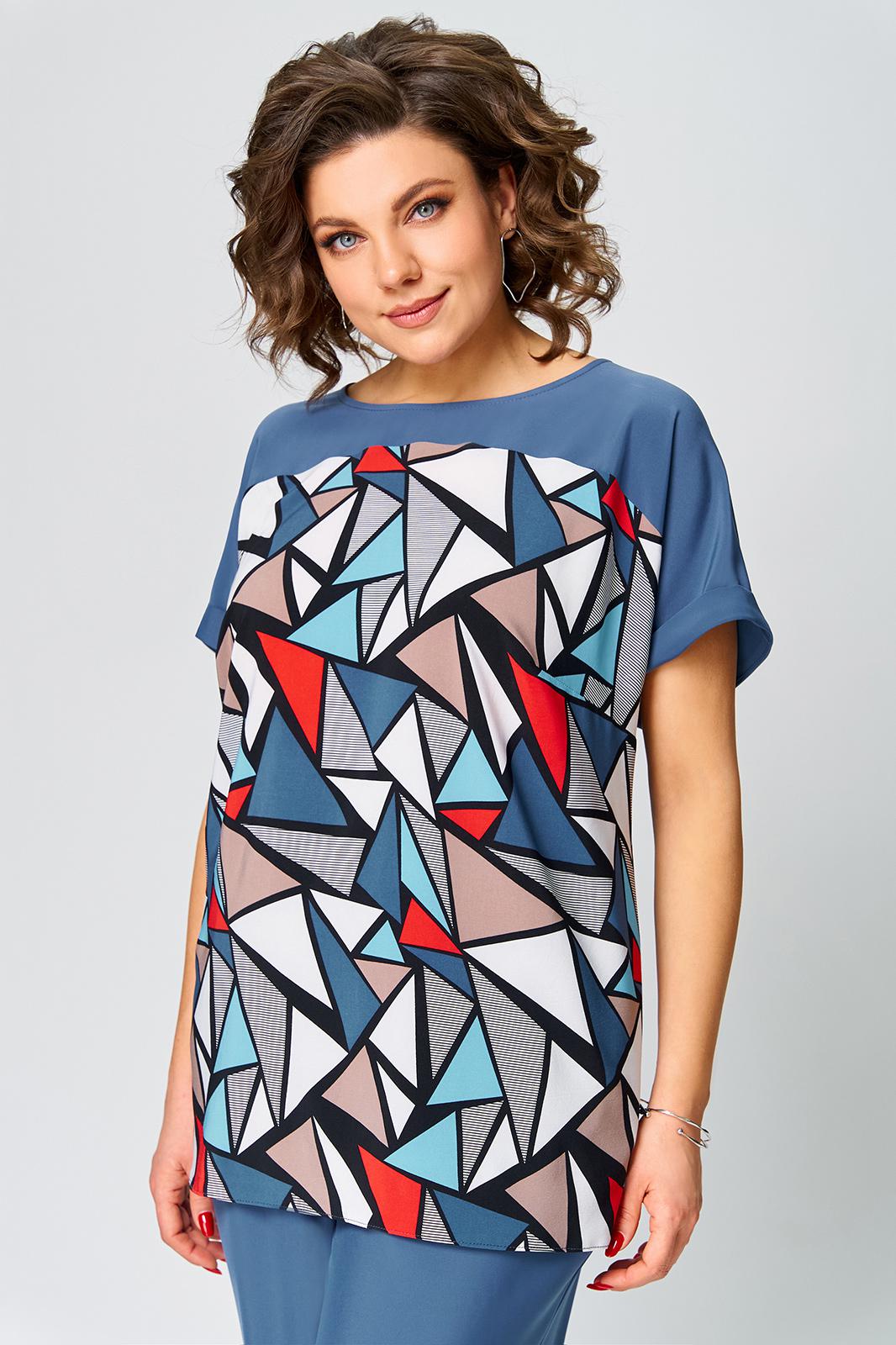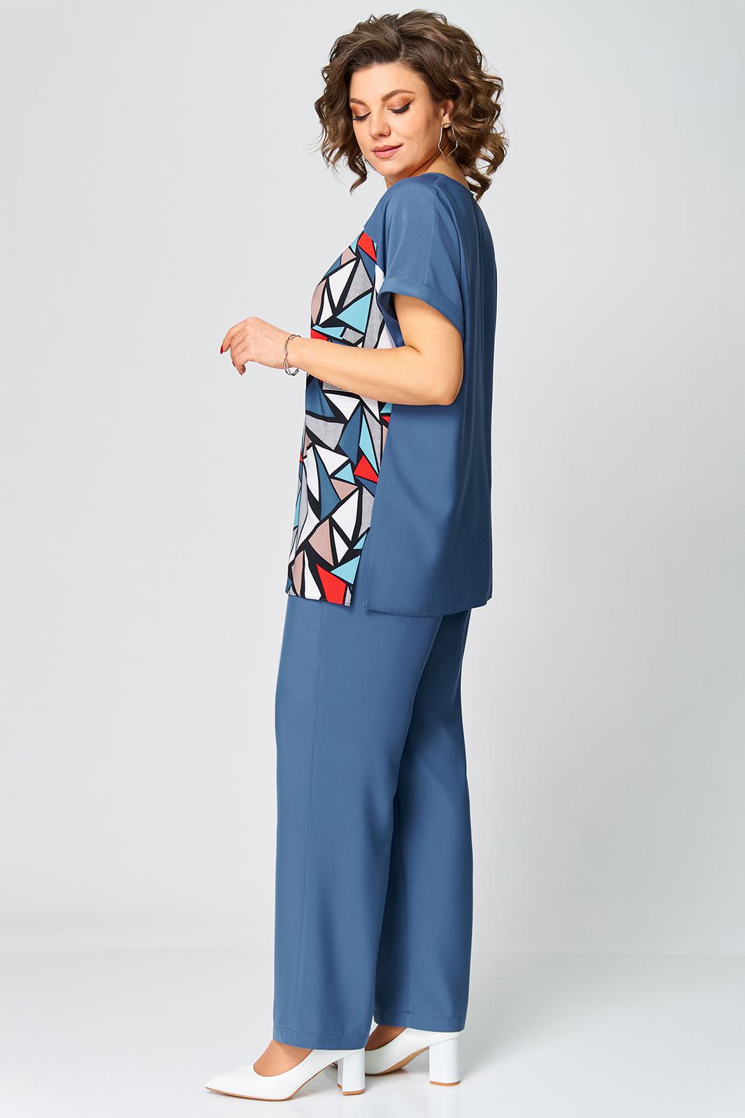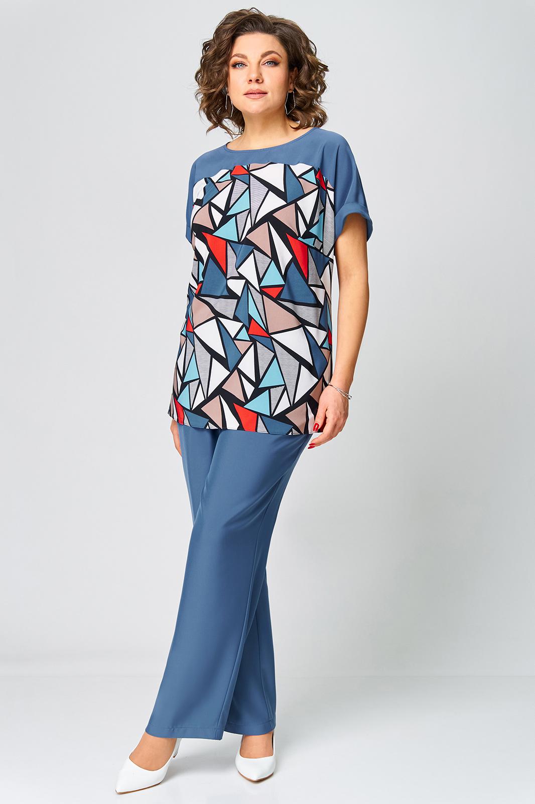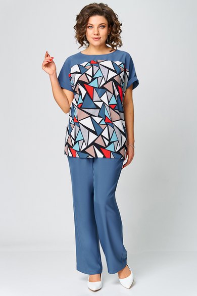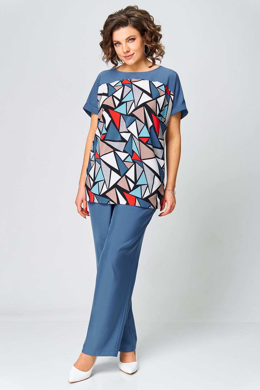 Комплект женский состоящий из блузки и брюк. Блузка свободного силуэта со спущенным цельнокроеным рукавом. Округлый вырез горловины обработан бейкой. По переду нагрудные вытачки. Спинка со средним швом. Кокетка по переду, спинка и рукава выполнены из сатина. Вставка по переду из крепа с геометрическим рисунком. Рукав спущенный с отложной манжетой. По бокам разрезы. Брюки прямого силуэта выполнены из сатина, на притачном поясе с резинкой, по бокам расположены наклонные карманы.