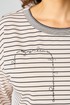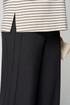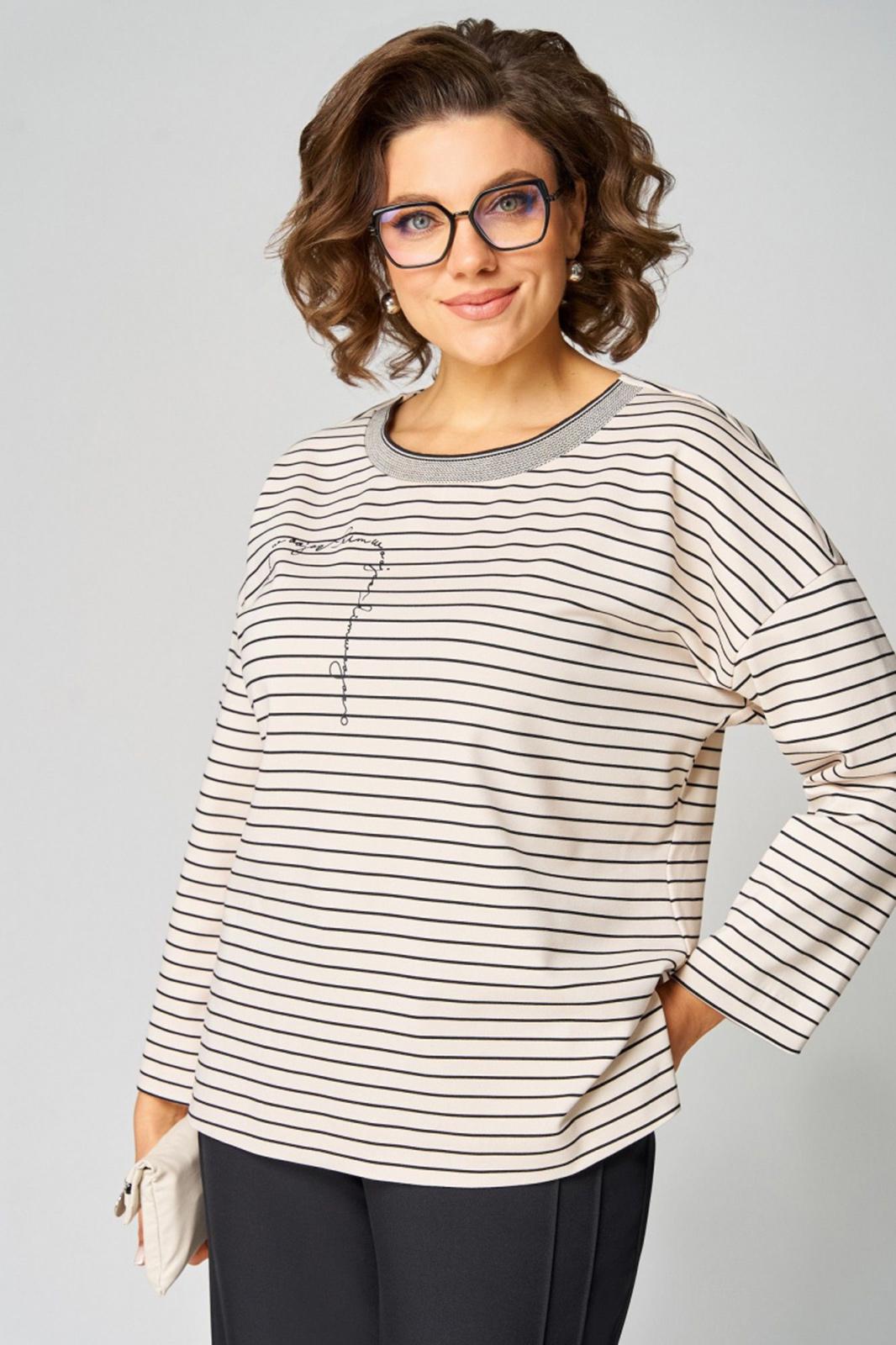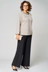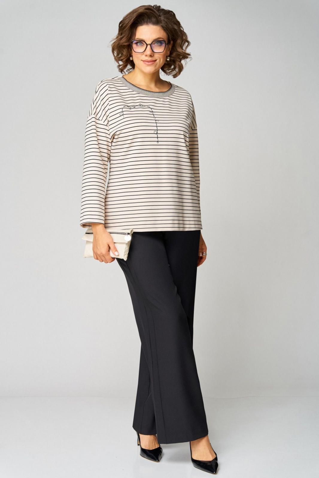 Комплект женский , двух предметный состоящий из туники и брюки. Туника прямого силуэта выполнена из трикотажного полотна « в полоску» . Горловина переда обработана довязом , горловина спинки обтачкой. Линия плеча спущена . По переду с правой стороны авторская печать. Рукав втачной, одношовный. Длина изделия по спинке- 65см, длина рукава от горловины – 66 см. По бокам имеются разрезы. Брюки палаццо прямого силуэта на притачном поясе, с застежкой на тесьму- молнию и 1 пуговицу и петлю, с боковыми наклонными карманами на передних половинках брюк . По передним половинкам брюк прострочены 2 канта. Для лучшего прилегания брюк в области талии в поясе со стороны спинки вставлена резинка. Длина брюк по боковому шву без пояса- 104 см.