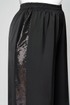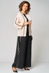 Комплект женский , двухпредметный состоящий из: туники и брюки. Туника прямого силуэта , со спущенной линией плеча . Округлый вырез горловины, обработан бейкой черного цвета. По переду с правой стороны отрезной рельеф , обработан бейкой черного цвета и вставка из пайеток. По переду имеется небольшой разрез. Спинка со средним швом. Рукав одношовный, центр рукава и по низу обработан бейка черного цвета. Длина рукава от горловины – 59см, длина по спинке -63см.Брюки прямые, пояс на эластичной резнике, по боковому шву лампас из пайеток. Длина брюк по боковому шву - 102 см.