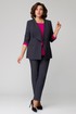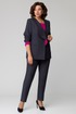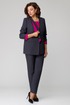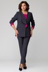 Комплект женский трехпредметный, затмит вашим образом. Жакет на подкладке с центральной застежкой на 1 петлю и пуговицу с асимметричным воротником и контрастной отделкой. По переду функциональные карманы. Спинка с рельефом выходящим из плеча и средним швом. Рукав втачной двухшовный с контрастной манжетой. Блузка с округлым вырезом горловины и спущенной линией плеча. Брюки классические средней посадки с боковыми карманами. Пояс с резинкой по бокам. Длина жакета 70 см, Длина рукава 58см. Длина брюк 102 см.