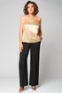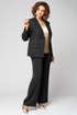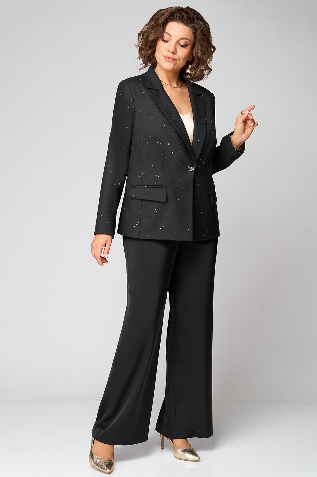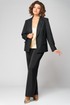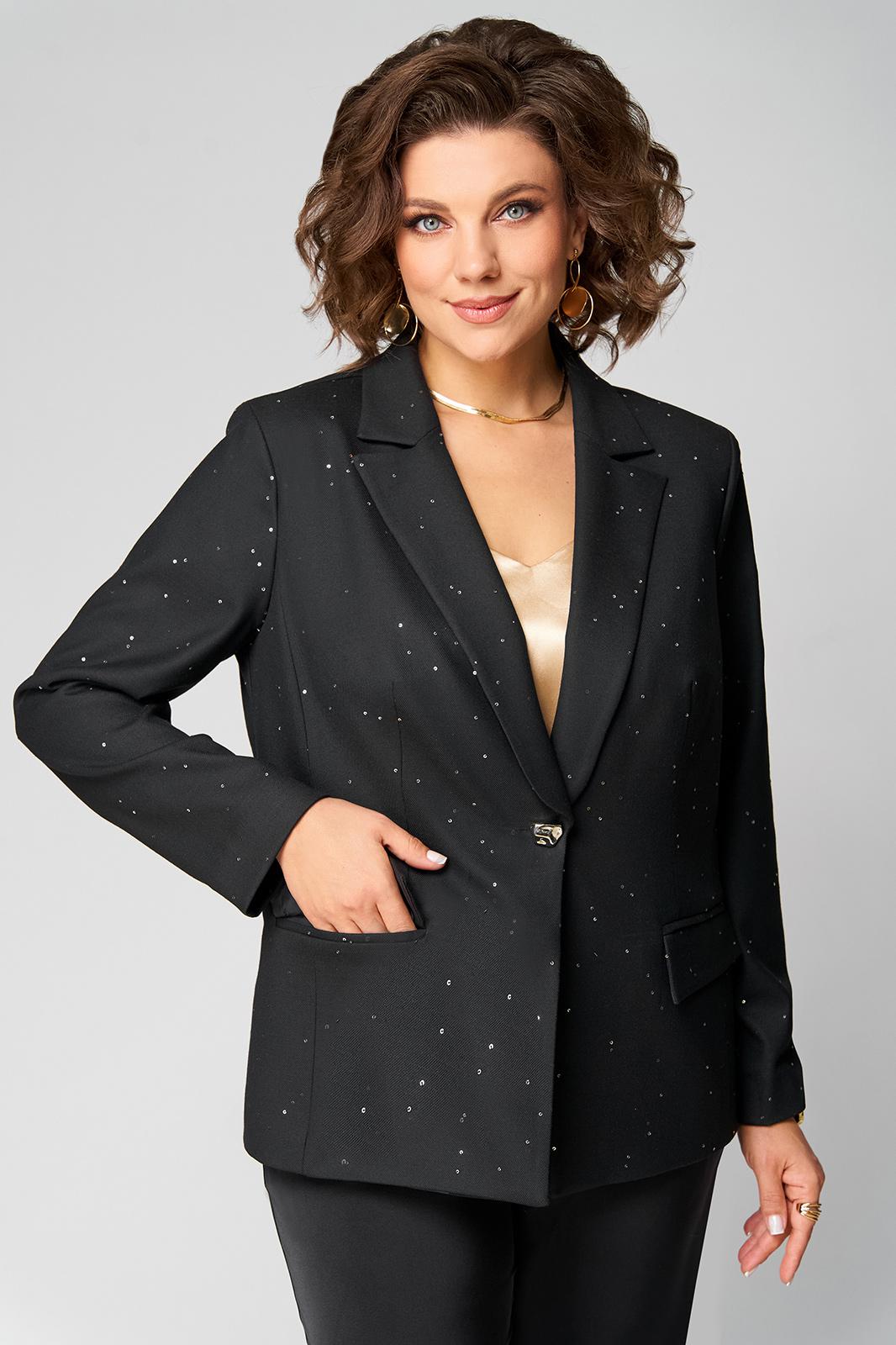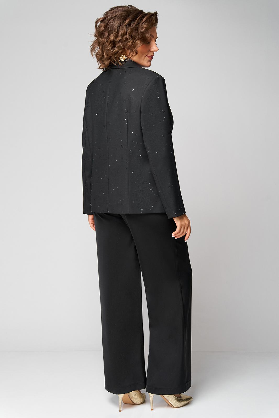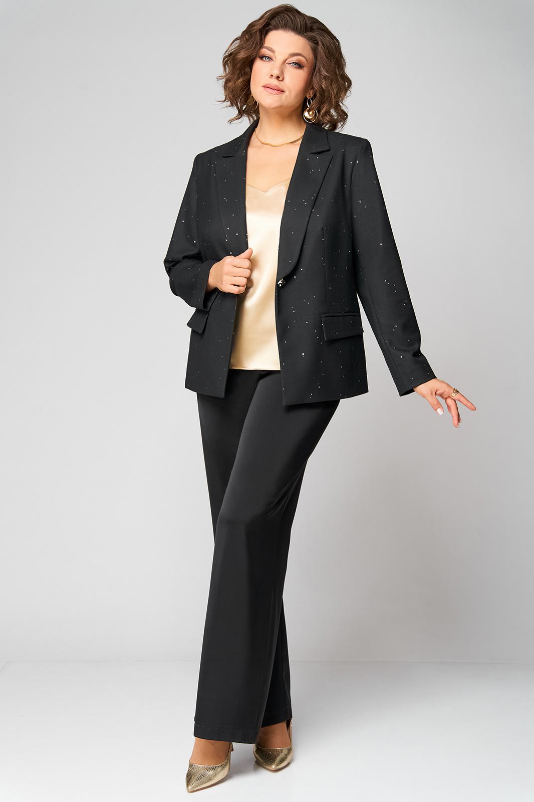 Стильный, женский двухпредметный комплект, жакет и брюки. Жакет выполнен из поли вискозной ткани в расшитые пайетки, частично на подкладке по переду. Воротник отложной с лацканами. По переду прорезные карманы в раму с клапаном. Застежка однобортная на 1 пуговицу и петлю. Длина жакета по спинке - 65см. Спинка со средним швом и талевыми вытачками. Рукав втачной, двухшовный. Длина рукава – 60 см. Брюки прямые из сатина. Длина брюк по боковому шву без пояса – 103 см. Брюки на поясе, по бокам резинка и косые карманы.Топ на бретелях с V-образным вырезом по переду и спинке. По переду застрочены нагрудные вытачки. Длина топа по спинке – 42 см