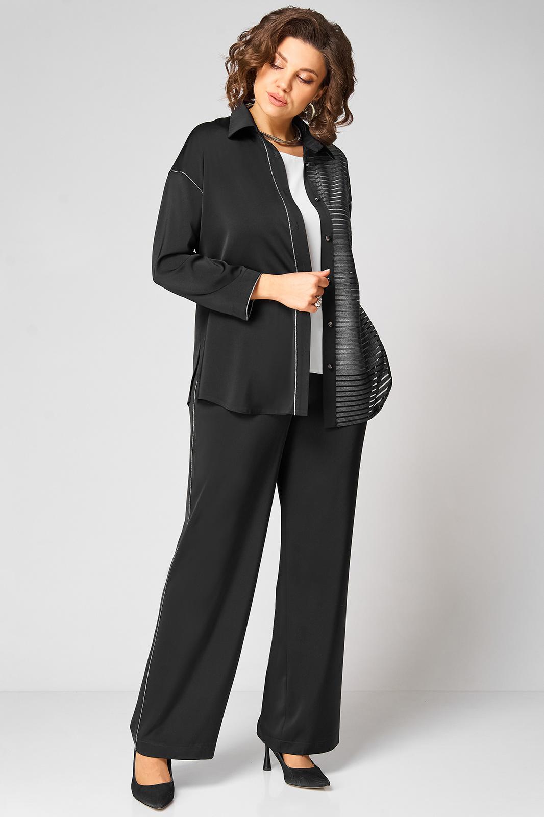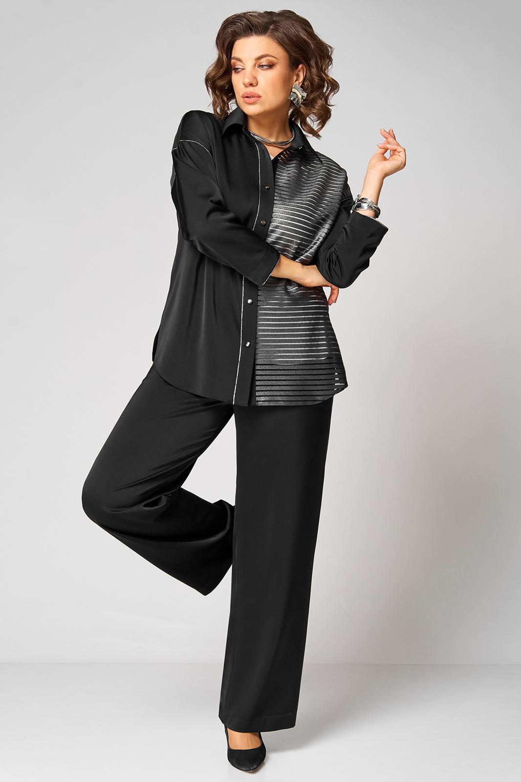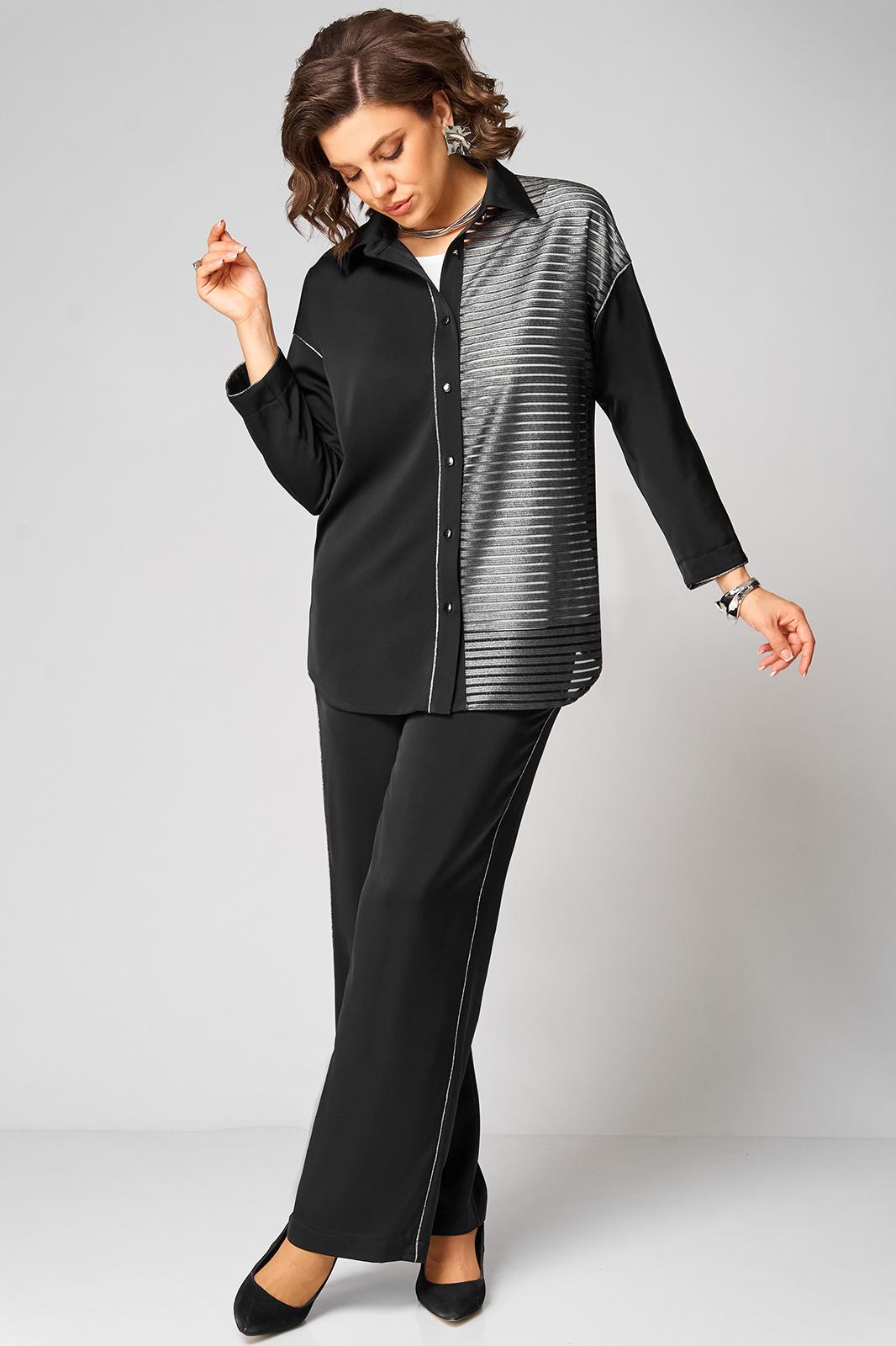 Элегантный женский комплект трехпредметный, состоящий из блузки, топа, брюк. Блузка прямого силуэта. Левая полочка выполнена из отделочной ткани в полоску. Рубашечный воротник. По правой планке настрочен декоративный серебристый кант. Спущенная линия плеча. Спинка цельнокроеная. Рукав одношовный по пройме и по низу рукава прострочен кант. Низ блузки фигурный с разрезами по бокам. Застежка по планке на 7 пуговиц и петель. Длина изделия по боковому шву (без пояса) -102см