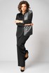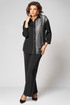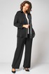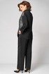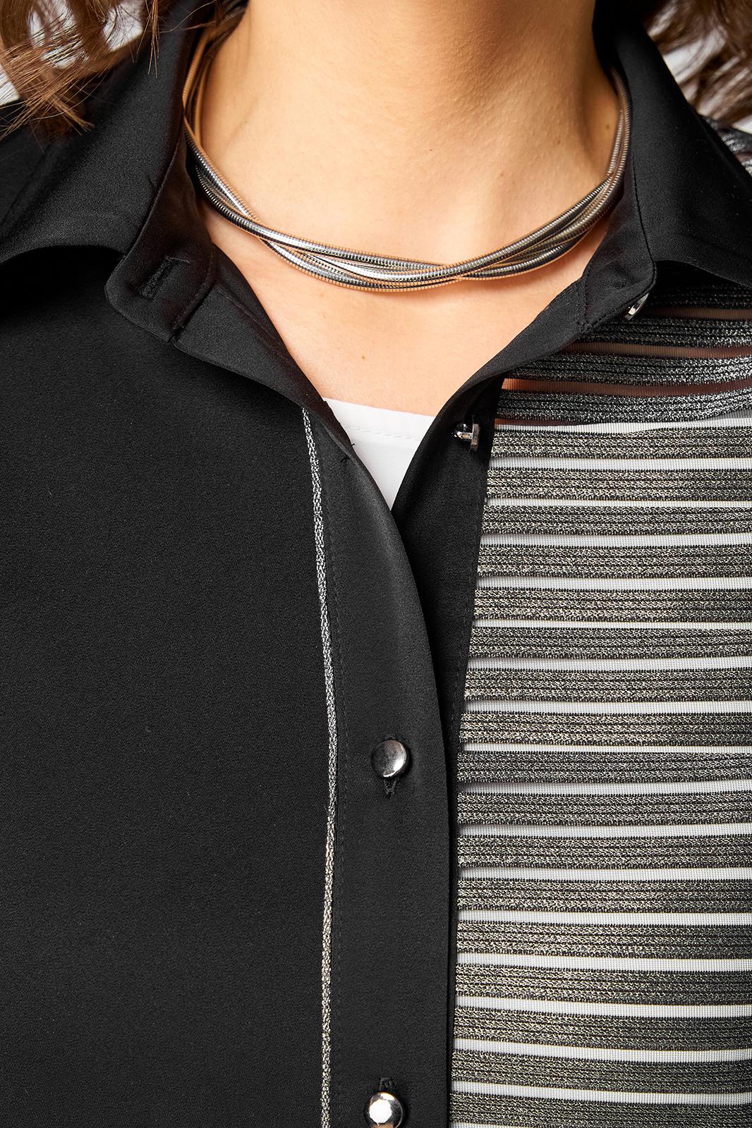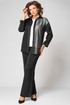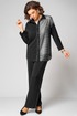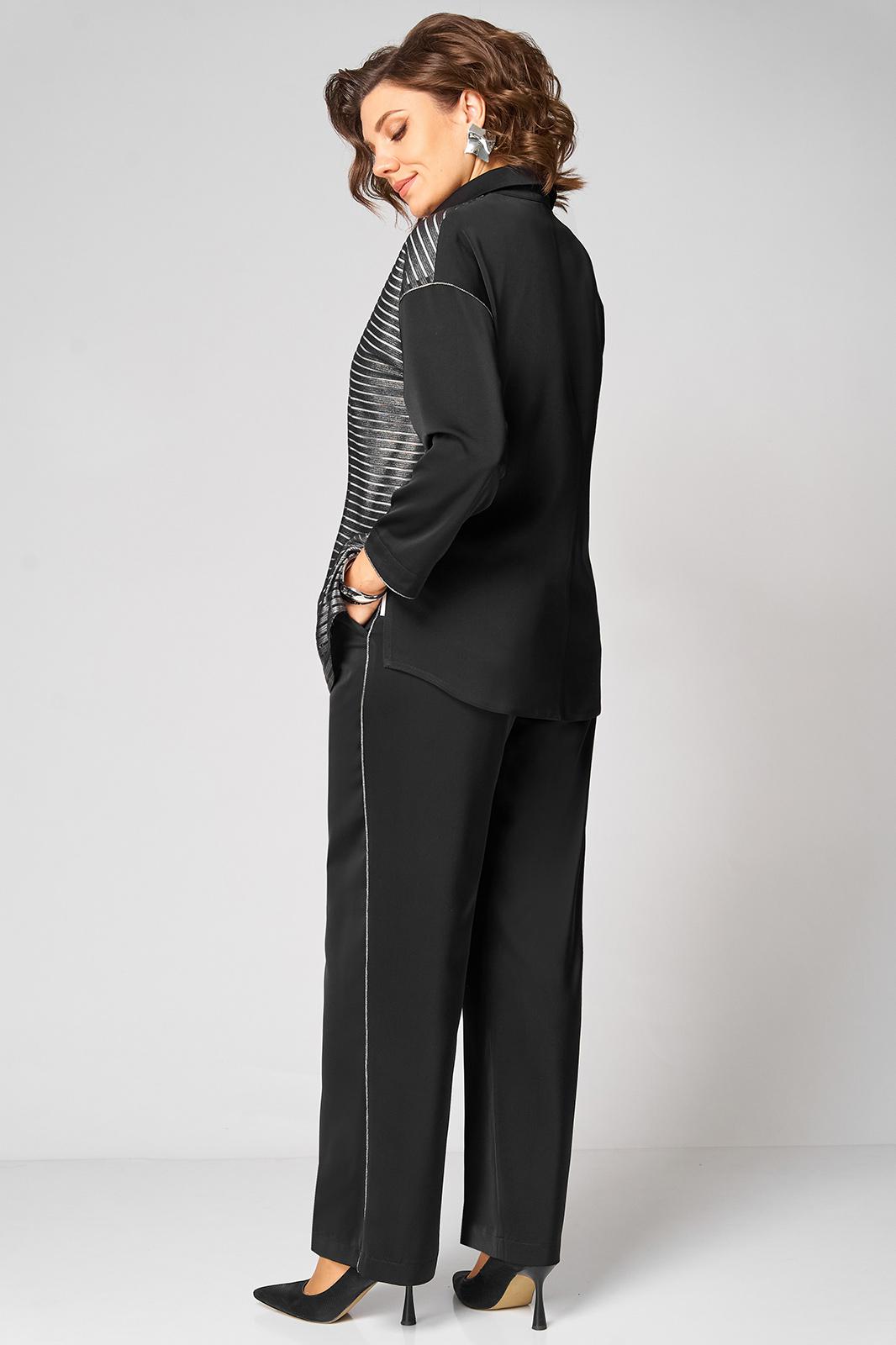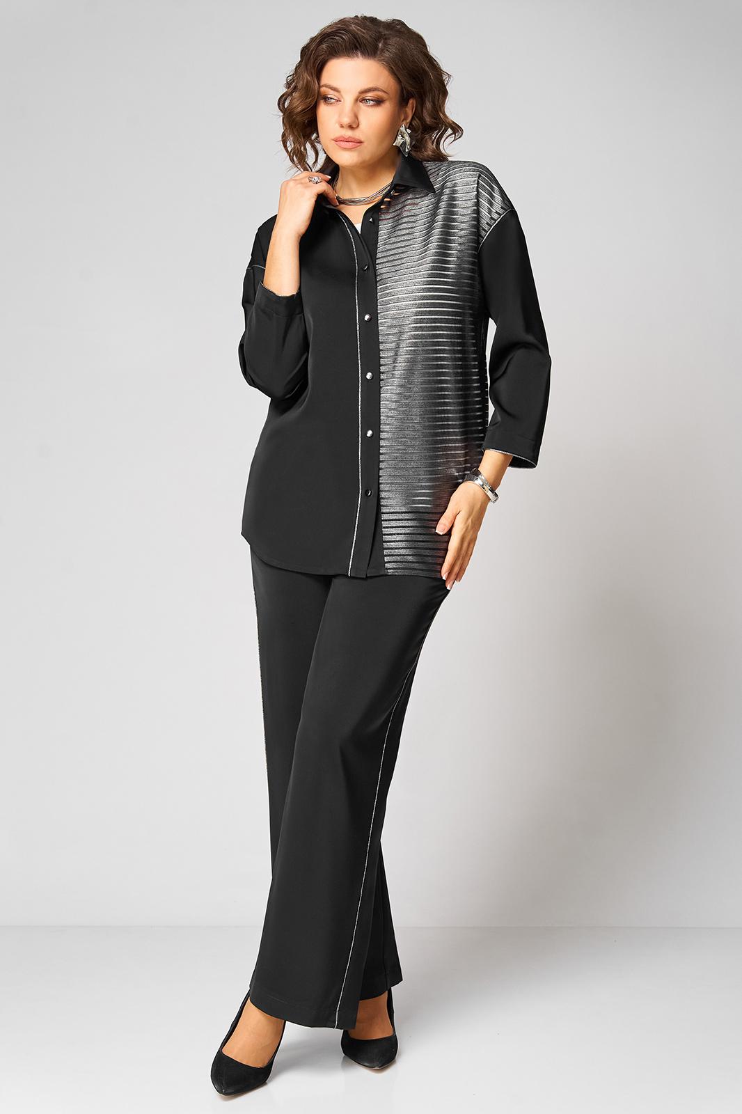 Элегантный женский комплект трехпредметный, состоящий из блузки, топа, брюк. Блузка прямого силуэта. Левая полочка выполнена из отделочной ткани в полоску. Рубашечный воротник. По правой планке настрочен декоративный серебристый кант. Спущенная линия плеча. Спинка цельнокроеная. Рукав одношовный по пройме и по низу рукава прострочен кант. Низ блузки фигурный с разрезами по бокам. Застежка по планке на 7 пуговиц и петель. Длина изделия по боковому шву (без пояса) -102см