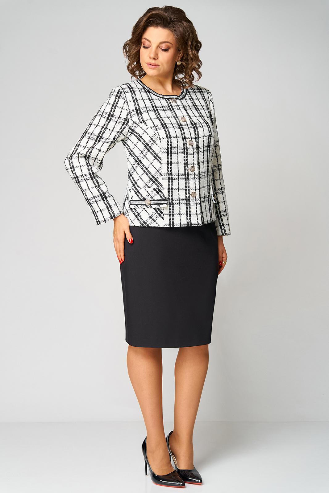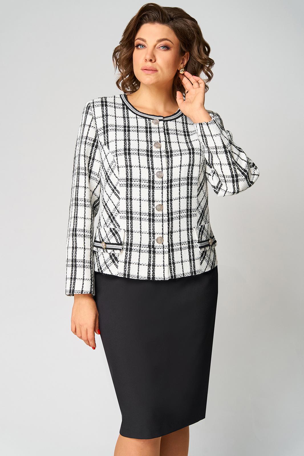 Красивый и стильный комплект в элегантном сочетании однотонной юбки и жакета. Жакет слегка приталенного силуэта на подкладке без воротника с застежкой на 5 петель и пуговиц. По переду жакета клапаны с декоративной тесьмой и пуговицей. Так же декоративная тесьма по горловине переда. Рукав втачной двухшовный. Спинка со средним швом и талиевыми вытачками. Юбка прямая, слегка зауженная к низу, на подкладке с притачным поясом, для максимального комфорта в поясе по бокам предусмотрена резинка. По спинке в среднем шве разрез и застёжка на молнию.