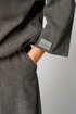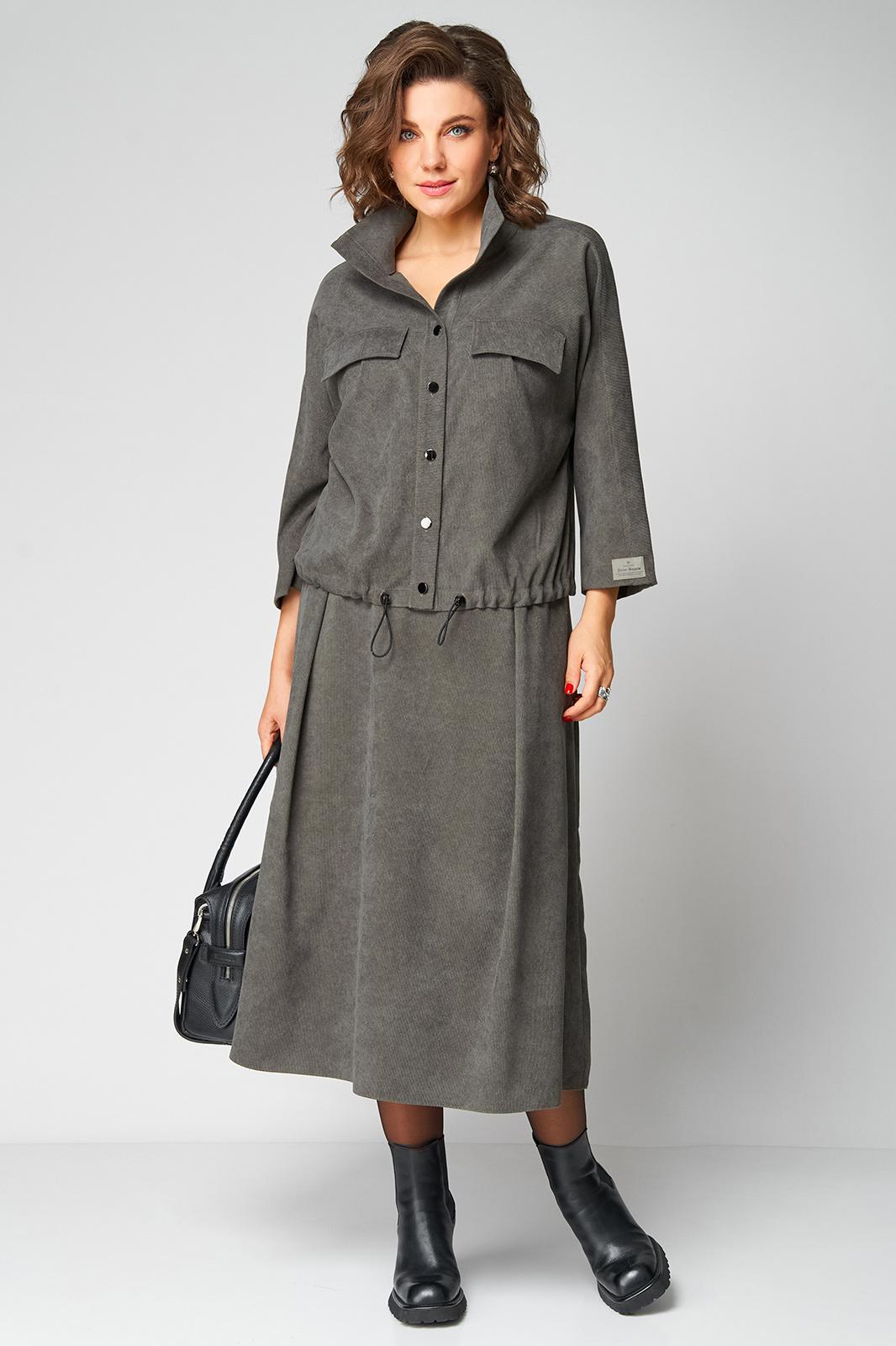 Комплект женский 2-ух предметный, состоящий из жакета и юбки. Жакет со спущенной линией плеча и цельнокроеным рукавом. По переду отрезная кокетка, воротник- стойка, рукава и планки. По переду настрочены нагрудные клапаны. Синка со средним швом. На левом рукаве о низу настрочена нашивка. Центральная застежка по планкам на 5 пуговиц и петель. Низ жакета можно регулировать с помощью эластичного шнура и фиксатора. Жакет без подкалки. Юбка на широкой обтачке А- силуэта, на подкладке. По переднему и заднему полотнищу заложены складки. По бокам расположены наклонные карманы. Застежка сзади на потайную тесьму-молнию.