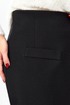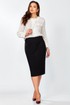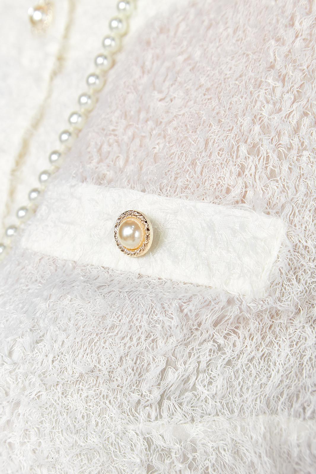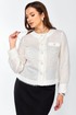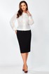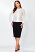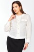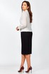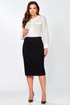 Блузка полуприлегающего силуэта выполнена из шифона «травки». Округлый вырез горловины. По переду настрочен нагрудный карман обманка листочка с 1 пуговицей. Спинка со средним швом и талевыми вытачками. Рукав втачной, одношовный на притачной манжете, застежка на 1 пуговицу и петлю . Застежка центральная 5 пуговиц и петель. Юбка с завышенной талией заужена к низу на обтачке выполнена. По переднему полотнищу юбки настрочена карман «листочка». Сзади разрез и застежка на потайную тесьму-молнию. Юбка на подкладке.